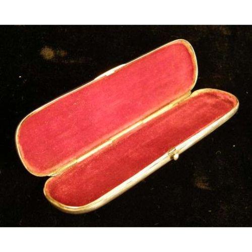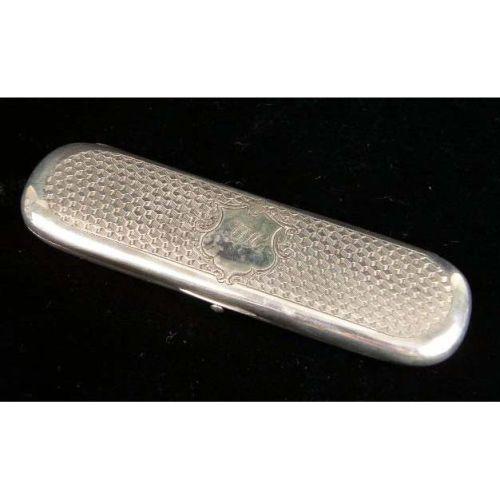 A SILVER PLATED OVAL HINGED FLAT BOX<BR><BR>With engine turned design, monogrammed "JHC", velvet lined, 4-1/2"long