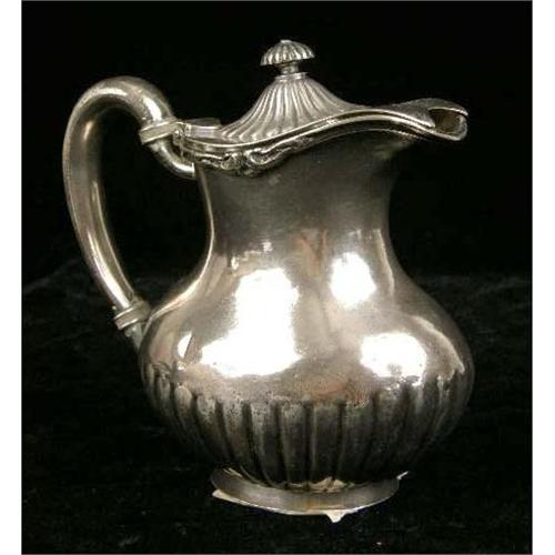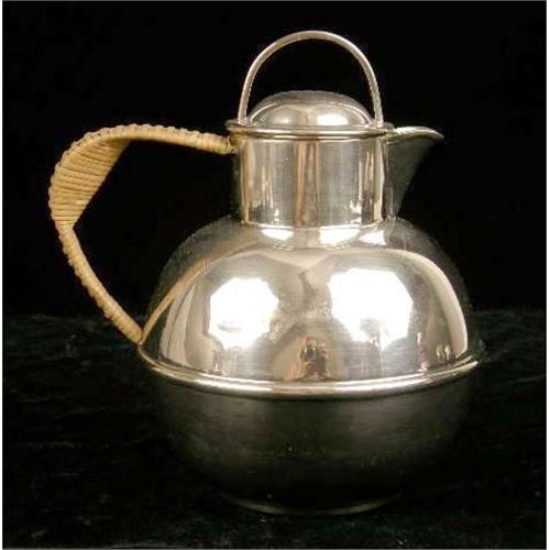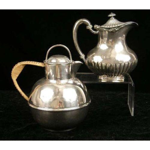 A SILVER PLATED SMALL COFFEEE POT<BR><BR>Together with a silver plated hot water pot with raffia handle, 7"high