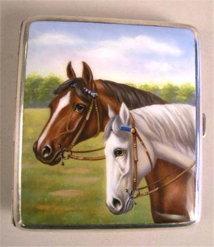 A SILVER WITH HORSE MOTIF ENAMEL CIGARETTE CASE; 3-1/4" X 2-7/8"