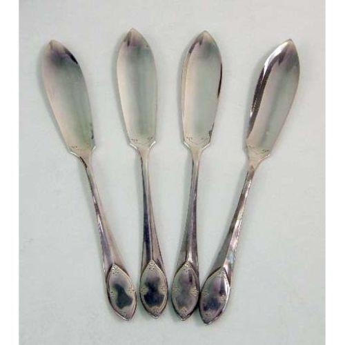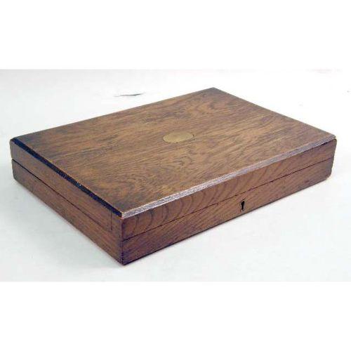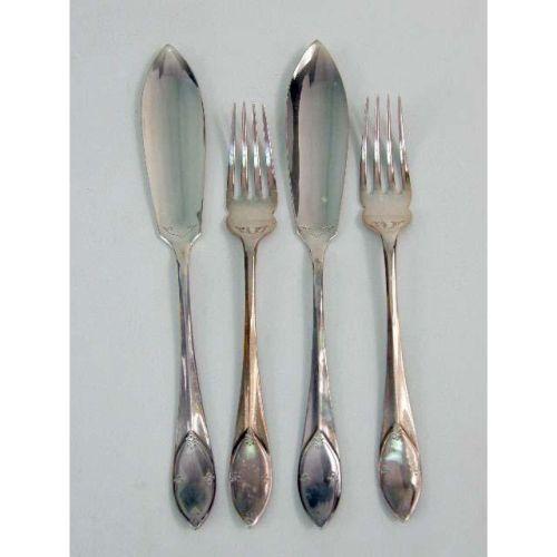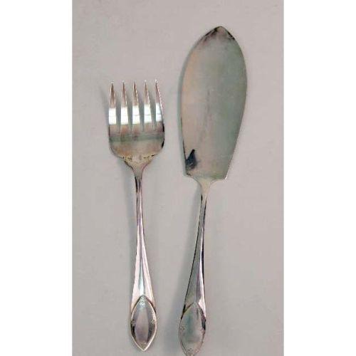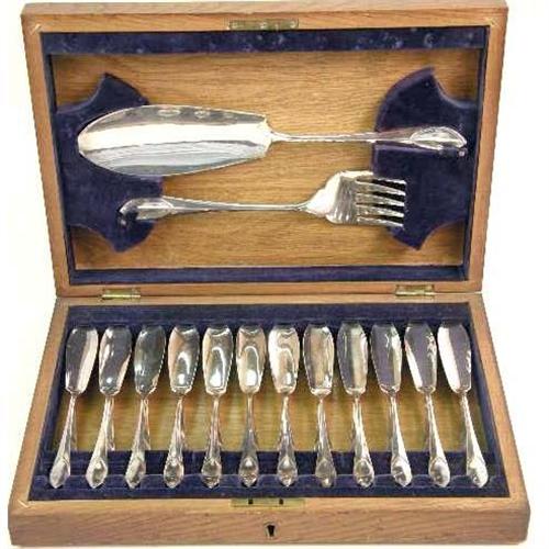 A SILVERPLATED FISH SET IN WOODEN HINGED LID PRESENTATION BOX<BR><BR>Comprising a serving knife and fork, and twelve fish knives and forks, box 9-1/4"l x 14"w