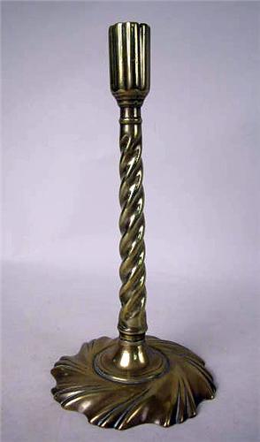 A SINGLE CAST-BRASS SWIRL-BASED CANDLESTICK; probably English, stem resoldered to base underneath, 1/2" loss to stem at base, wear and tiny dents, 10" h