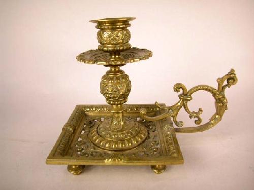 A SINGLE ORNATE CAST BRASS CHAMBERSTICK, FRENCH; 6"h x 5" square