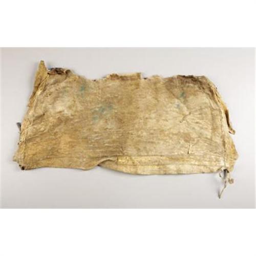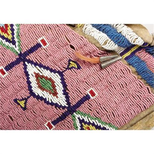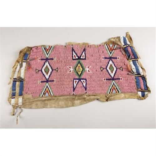 <B>A SIOUX BEADED HIDE FRAGMENT<BR><BR></B></I>c. 1900 the front of a tipi bag, sinew sewn and lane-stitched in numerous shades of opaque beads, with typical geometric motifs<BR><BR>Length: 22 inches <B>Condition Report:</B> Overall poor. Fragment only. Hide stiff. Beadwork with loss. No apparent restoration.<BR><BR><b>Shipping:</b> Requires 3rd Party Shipping (<a target="_blank" href="http://www.heritageauctions.com/common/shipping.php">view shipping information</a>)