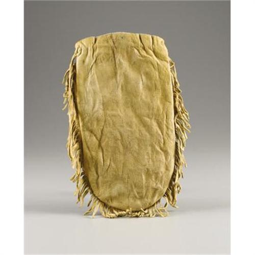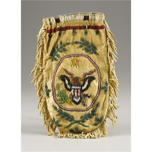<B>A SIOUX BEADED HIDE POUCH<BR><BR></B></I>c. 1915 one side decorated with a patriotic eagle in various shades of glass seed beads, short hide fring around the bottom perimeter<BR><BR>Length: 12 1/2 inches <B>Condition Report:</B> Overall very good. Beadwork with minor loss. Hide fringe intact. Hide with light wear and soiling. No apparent restoration.<BR><BR><b>Shipping:</b> Requires 3rd Party Shipping (<a target="_blank" href="http://www.heritageauctions.com/common/shipping.php">view shipping information</a>)