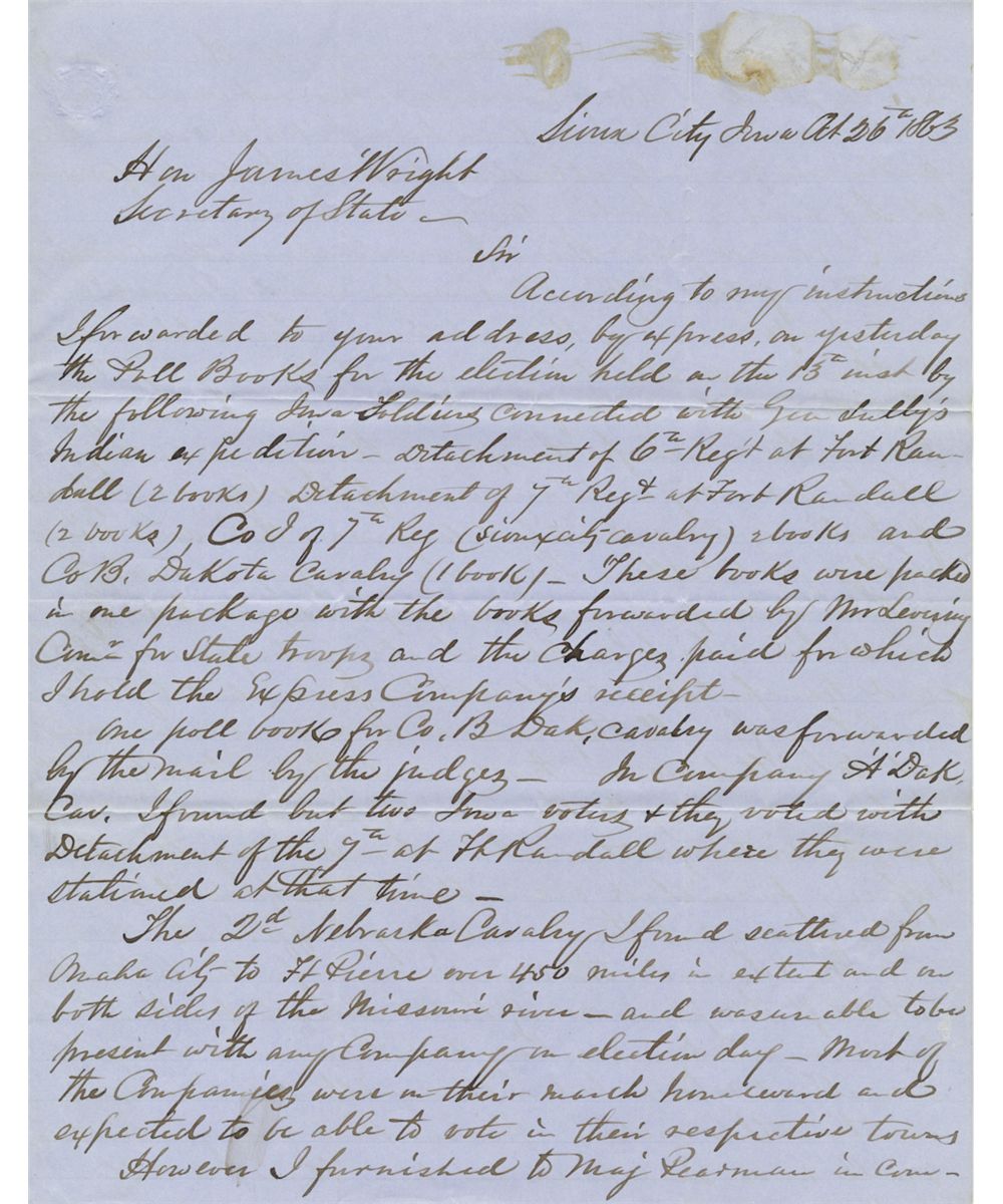 An interesting war-date A.L.S. of J. C. C. Hoskins, a Dartmouth engineer, who headed west to Leavenworth and Sioux City 1857. In 1863, he served as Commissioner for Elections for the state of Iowa.His job was to ride all over the west getting poll books from various cavalry regiments. The letter is 3pp. 4to., Sioux City, Oct. 26, 1883, and penned to Iowa Secretary of State James Wright, in part: "...I cannot close this communication without saying something of the difficulties under which I have labored in small detachments all the way up to Fort Pierce 350 miles from this place, and most of them on the march for this place through a country which is mostly a wilderness infested by every squad of Indians more hostile and dangerous than ever since Sully's great battle. There is no safety in moving outside of camp anywhere except as protected by an escort which could not always be procured and transportation could not be furnished by the military for all they had and more too was needed to withdraw our troops and their stores from Indian country to the various points where they go into winter quarters. I am bound to say the officers furnished me with all the facilities in their power, but these were very inefficient...". Old gluestain at top right corner, clear of text, otherwise very good.