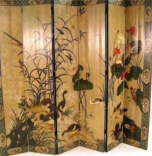A SIX PANEL BLACK LACQUERED AND PAINTED DECORATED SCREEN; Each panel opening to create a lake with flowers and waterfowl scene; Each panel 84" x 16"