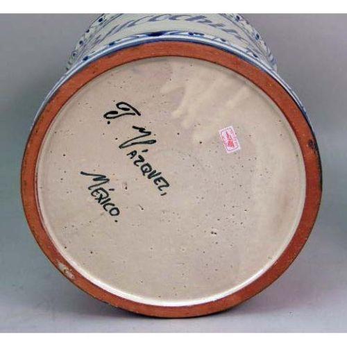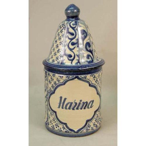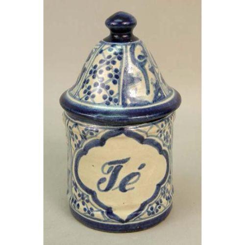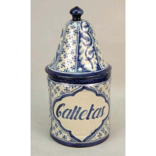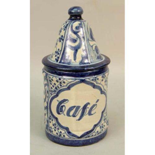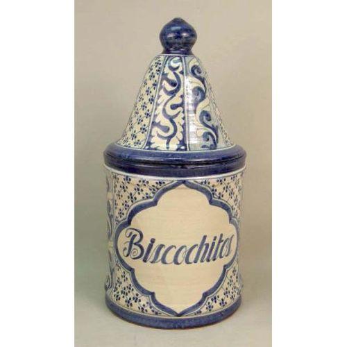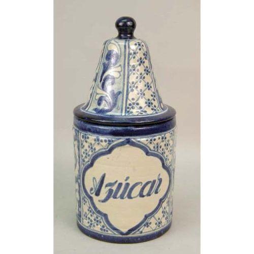 A SIX PIECE BLUE-AND-CREAM KITCHEN CANISTER SET<BR><BR>Mexico. Comprising holders for biscuits, cookies, flour, sugar, coffee and tea. The largest 20" h x 10" d.