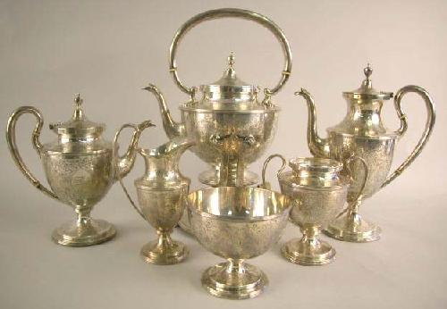 A SIX PIECE S. KIRK STERLING SILVER TEA & COFFEE SERVICE (1903-1924); Crested, all-over engraved floral motif, comprising: coffee pot, (handle loose), 11"h, teapot 8"h (handle loose), hot water kettle on stand with burner on four shell-form feet, 14-1/4"h, cream jug 7"h, sugar bowl, missing lid, 5-3/4"h, waste bowl, 4-1/8"h, dented, apx. 140 T.O.