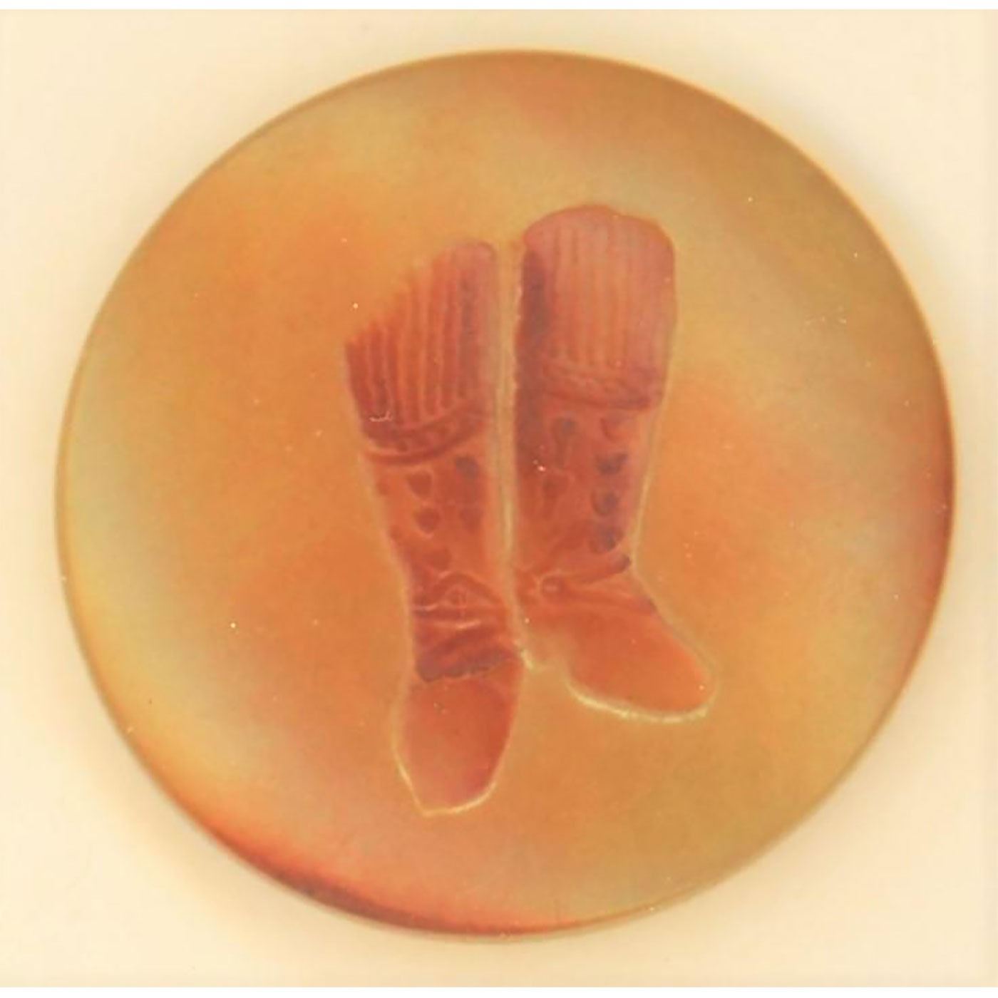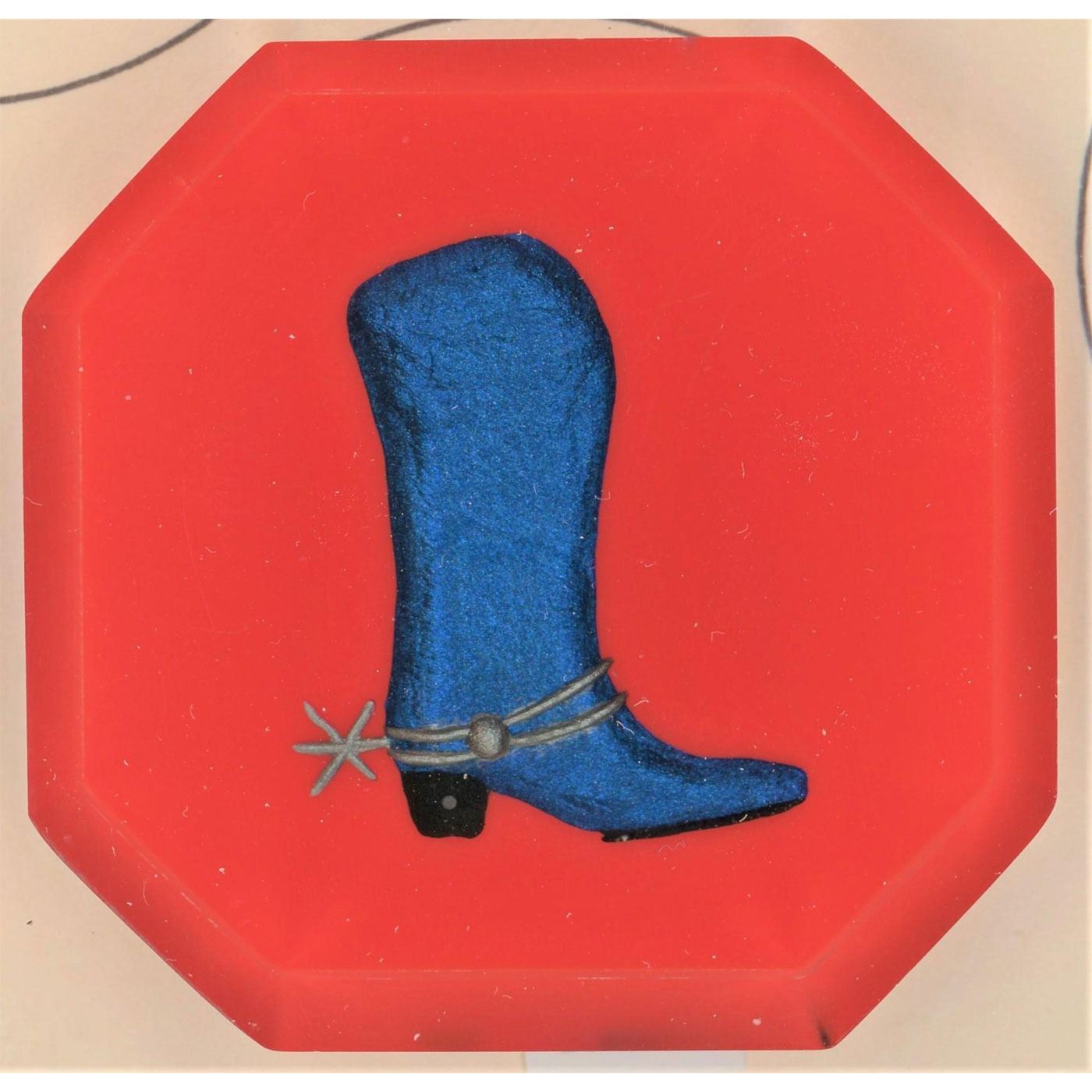 10 M/L assorted materials depicting different style shoes. Here we have an assortment of shoes including a VI boot, a great reverse carved Lucite boot, a wonderful silver realistic enamel and silver ballet slipper and more.
