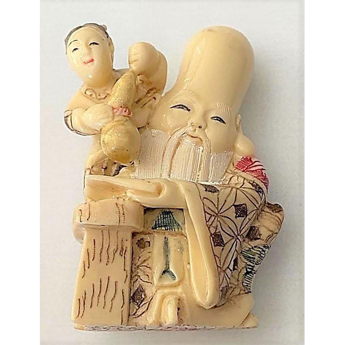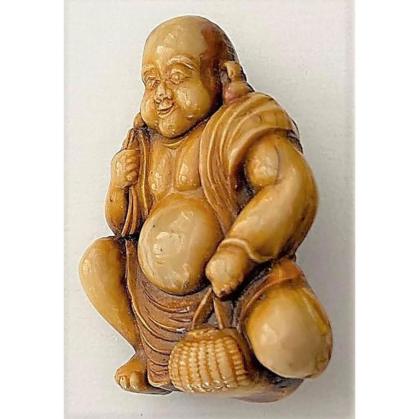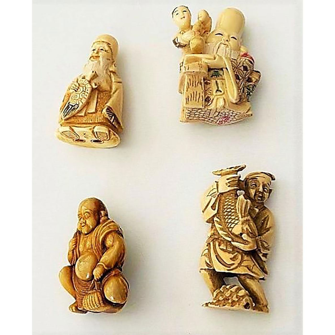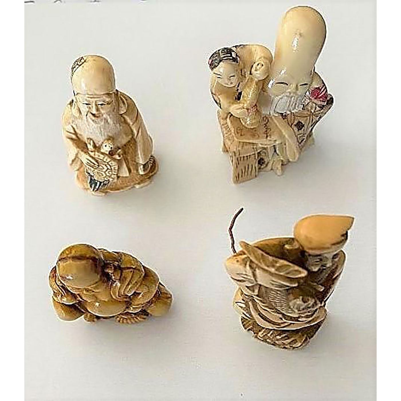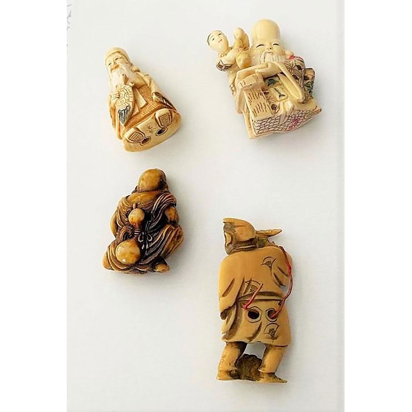 4 Large natural material early 20th century Netsukes. These 4 examples from Japanese carvers are quite detailed and in wonderful condition. The Japanese did not use buttons but they did use Netsukes on their sash along a rope with an Inro (sectioned box) and an Ojime bead. The Netsuke work be the piece used to tighten the piece.