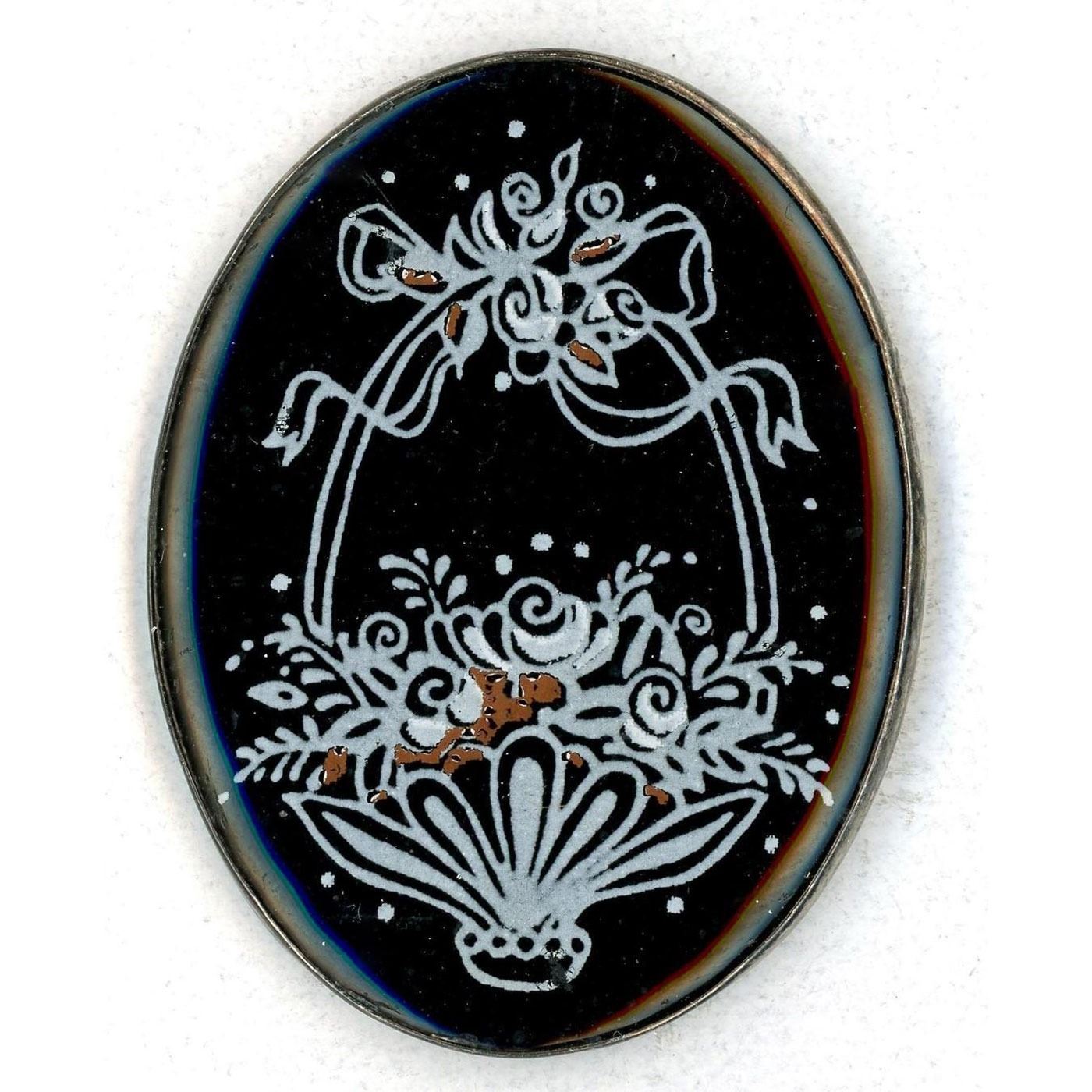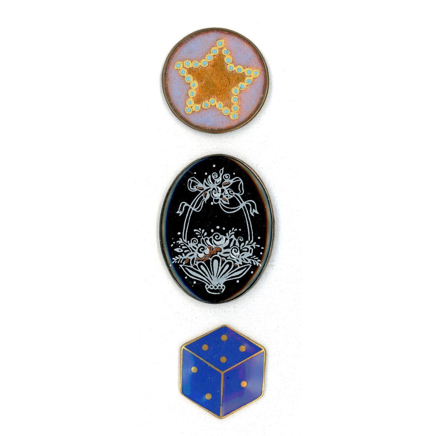 3 Medium/Large 20th century enamels including a great Basket. Here we have a wonderful large oval black and white enamel by the late Phil Linley which is signed and set in Sterling, a really nice star encrusted enamel that is counter enameled and a realistic dice.