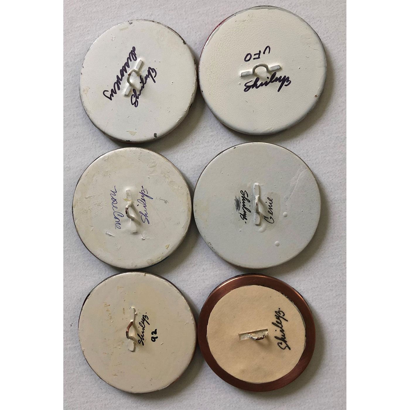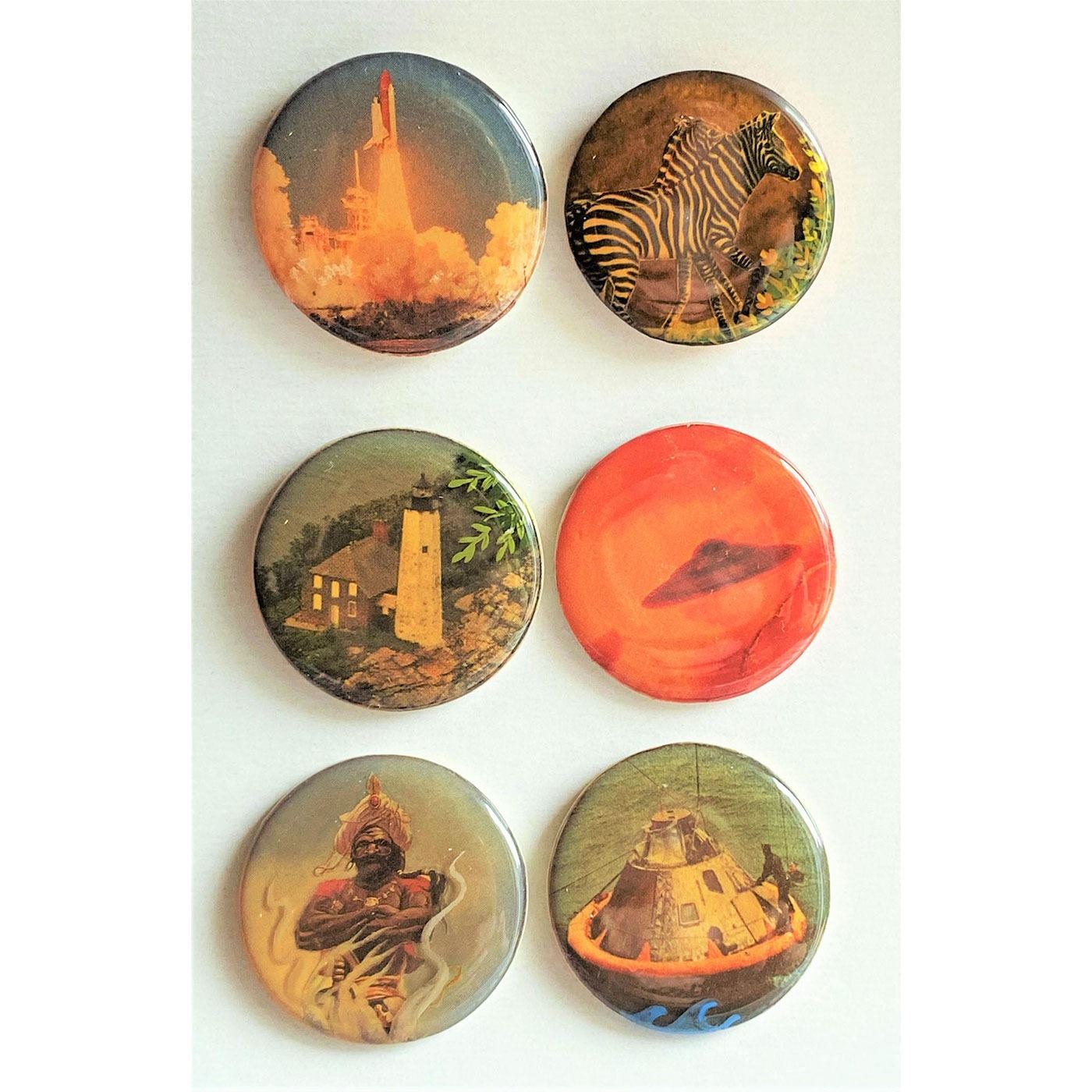 6 Large late 20th century studio buttons by Shirley Burgess. These 5 buttons including carious scenes and a zebra were created and signed by Shirley Burgess the Daughter of Harry Wessel. She used watch crystals like her father to cover the paper pictorials.
