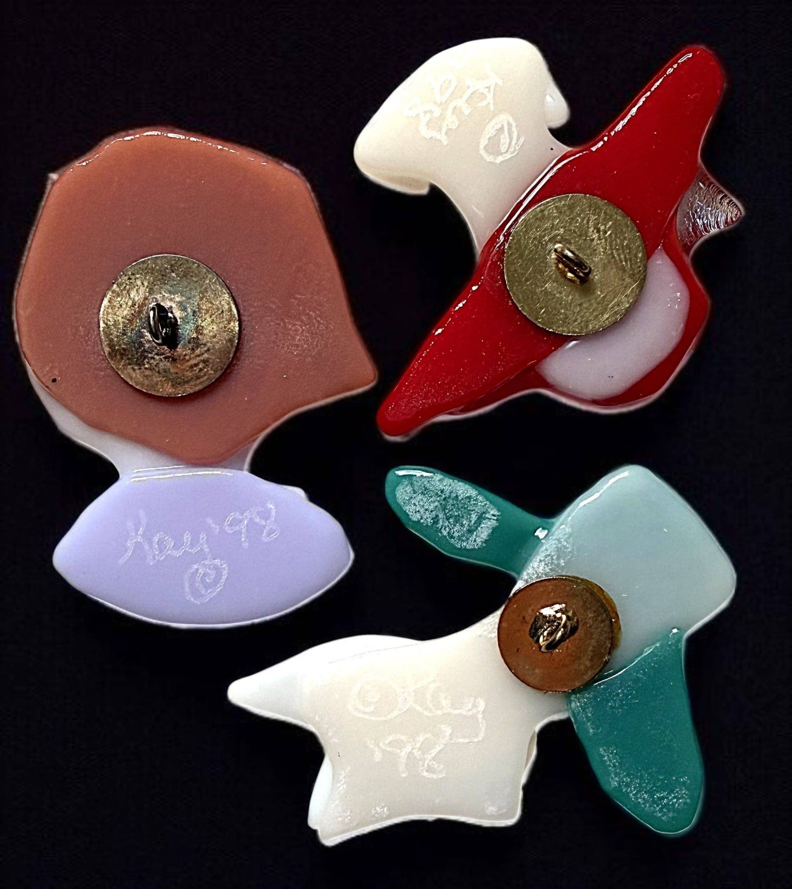 3 Large late 20th century examples by Kay Ferguson. This small card of these hand made lampwork buttons by Kay Ferguson are beautifully crafted. Kay has been a mainstay artist in the button world for many a year, and is quite a talented artist.