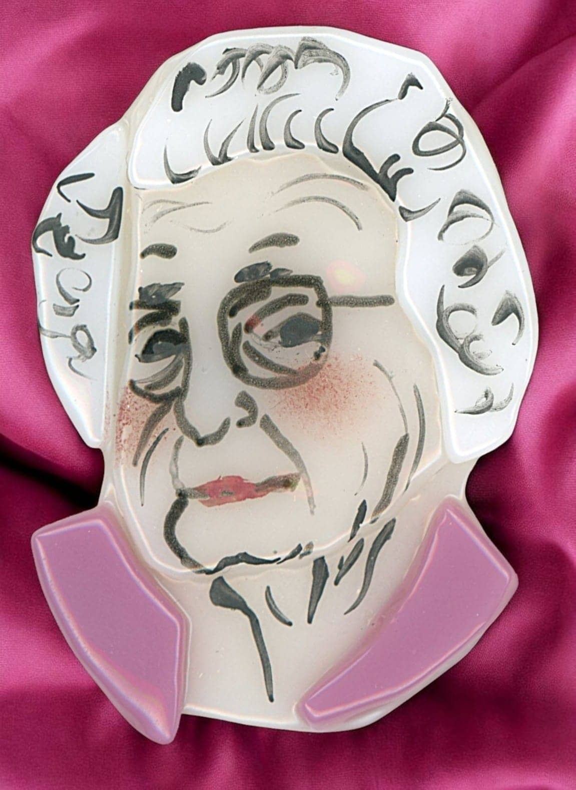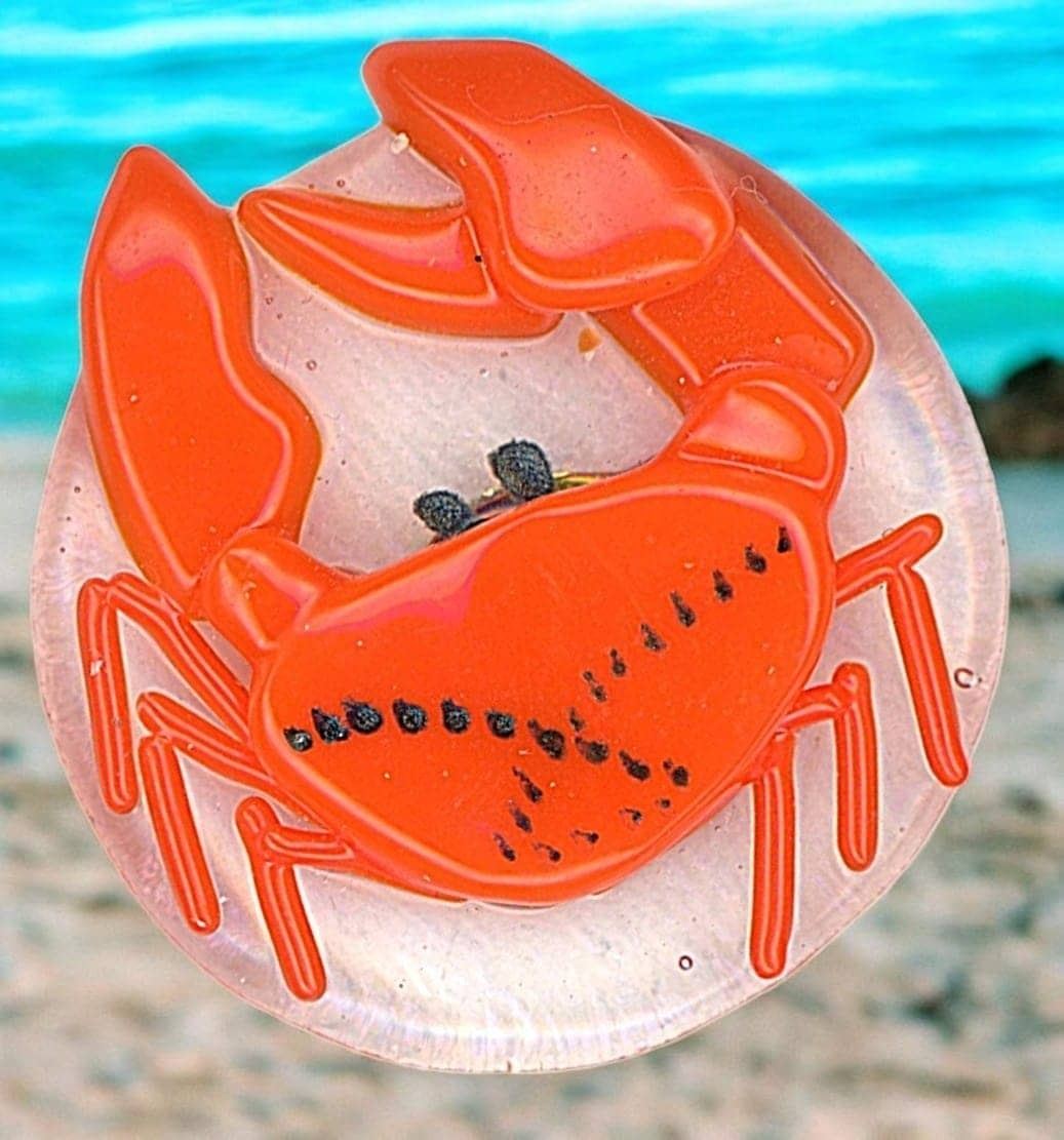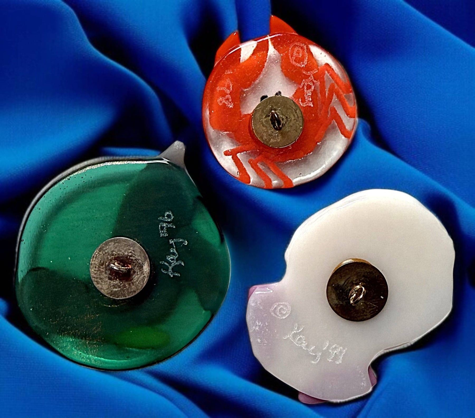 3 Large late 20th century examples by Kay Ferguson. This small card of these hand made lampwork buttons by Kay Ferguson are beautifully crafted. Kay has been a mainstay artist in the button world for many a year, and is quite a talented artist.