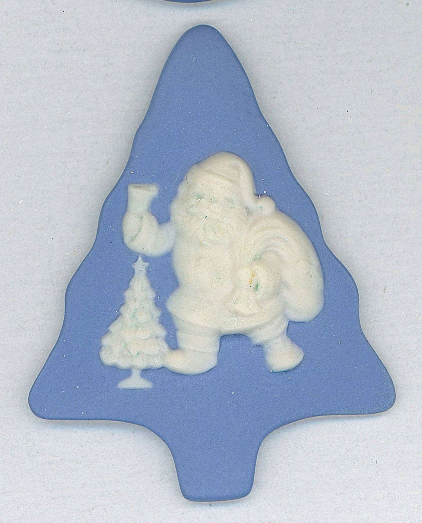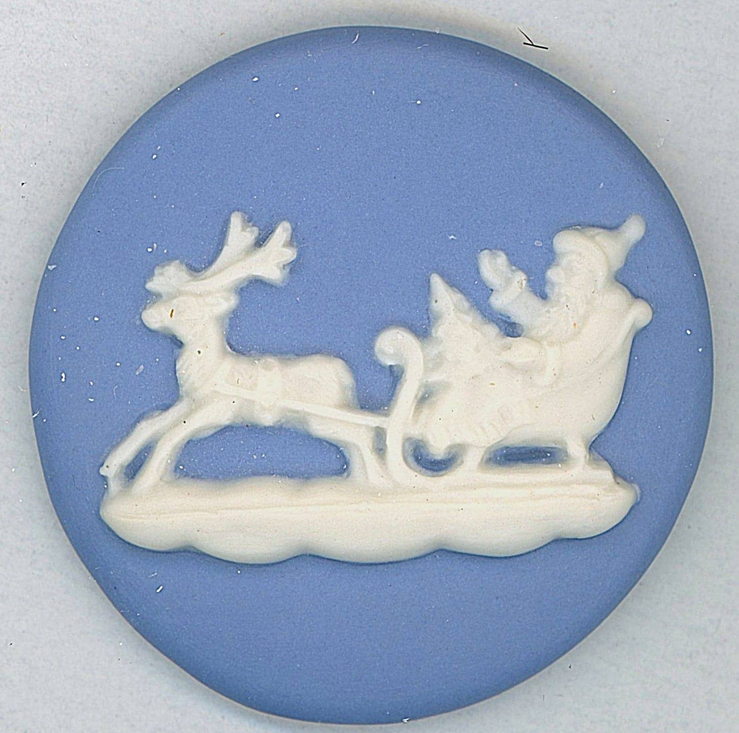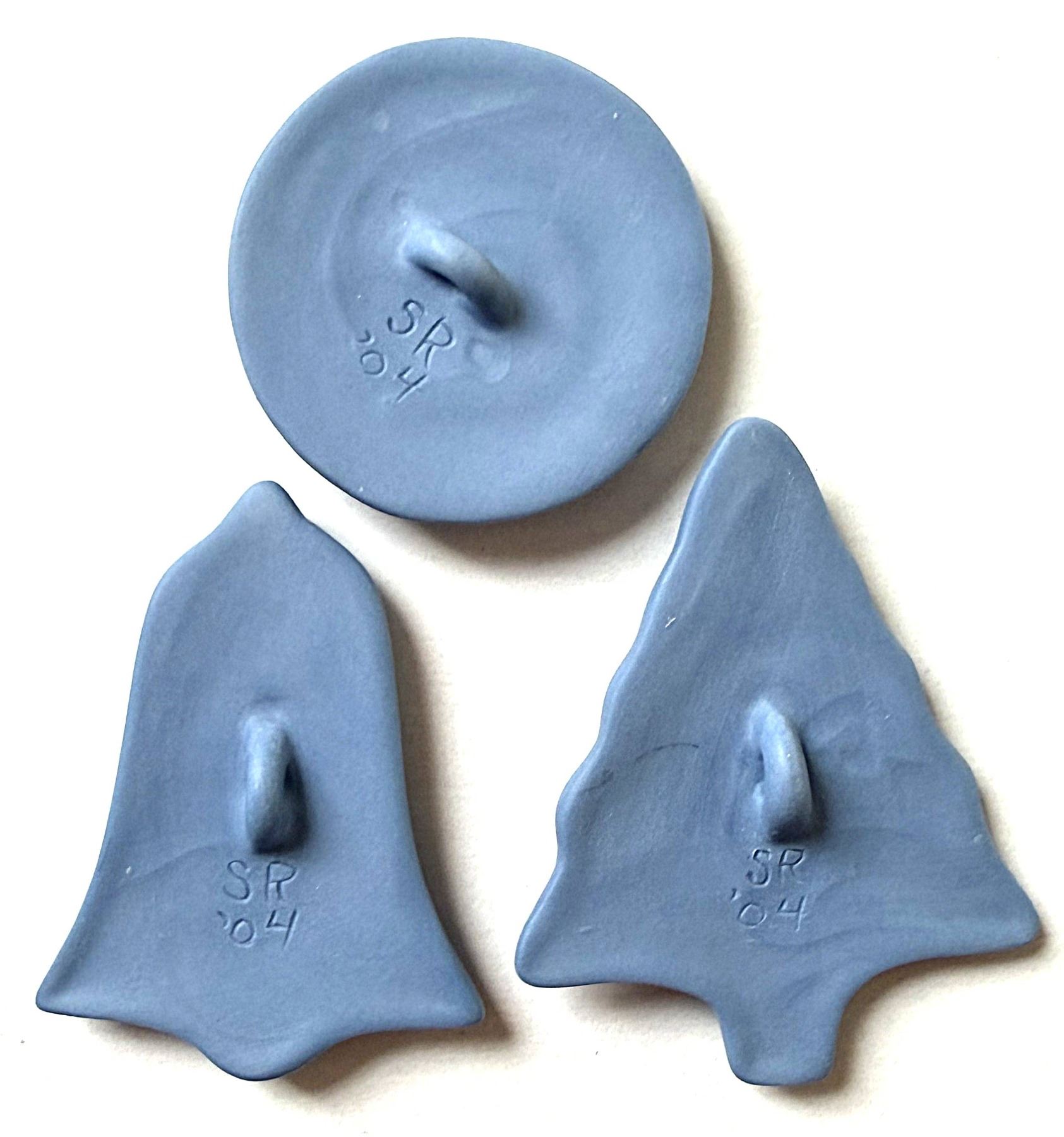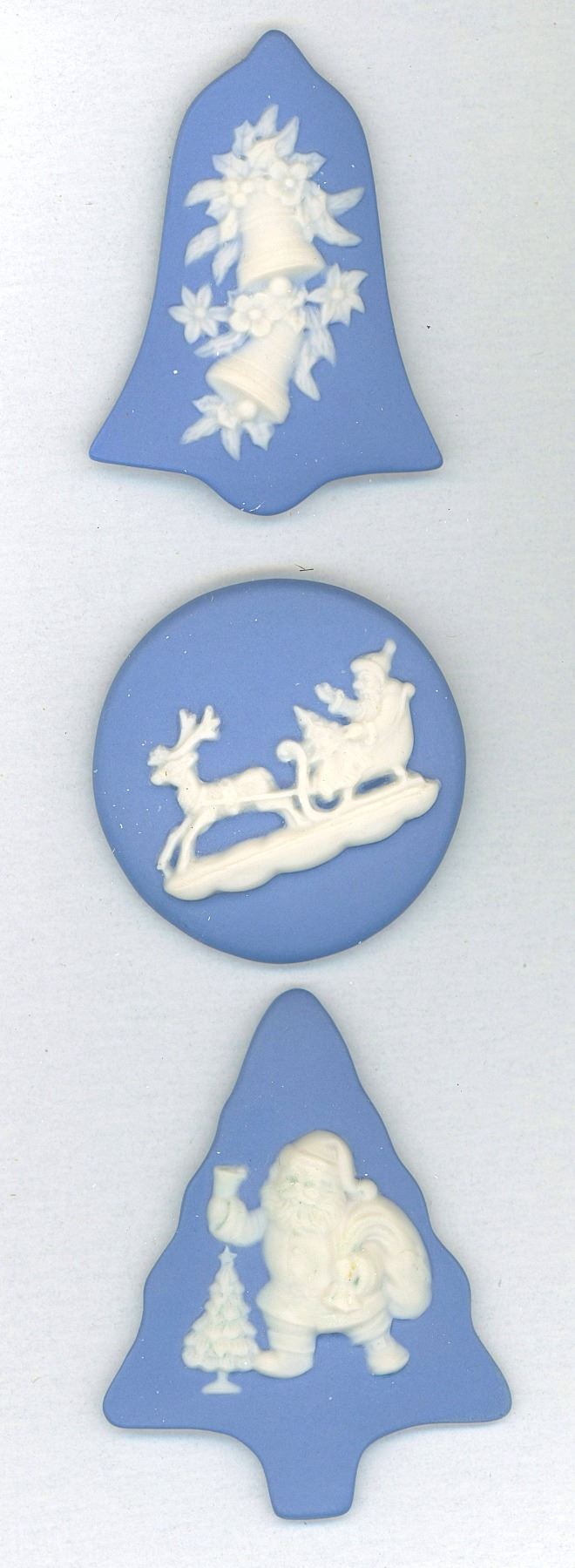 3 EX-Large 20th century blue Jasperware examples by Rzanski. The buttons on this small card are all dated 2004 and depict various Christmas scenes. Some nice shapes too.