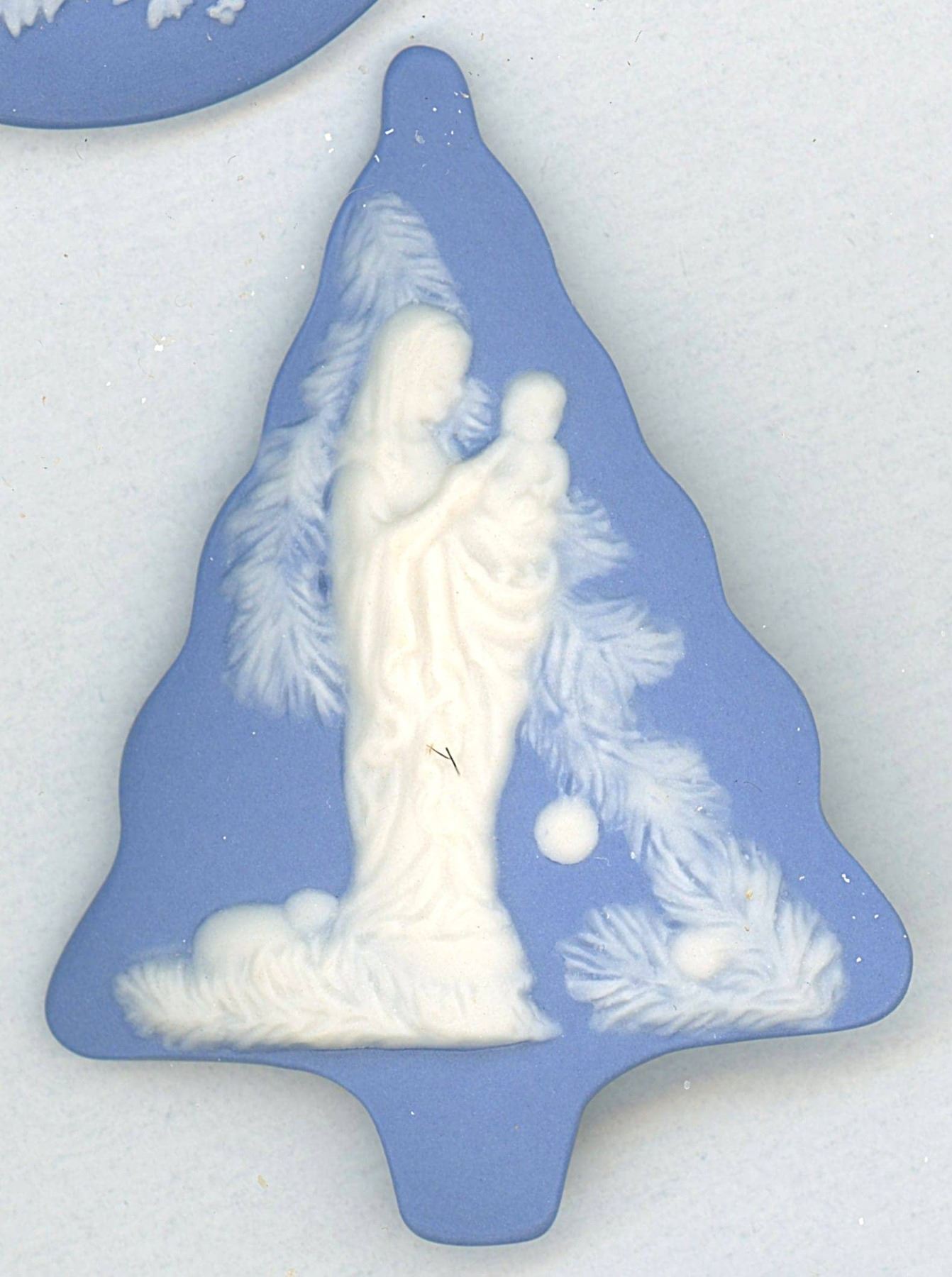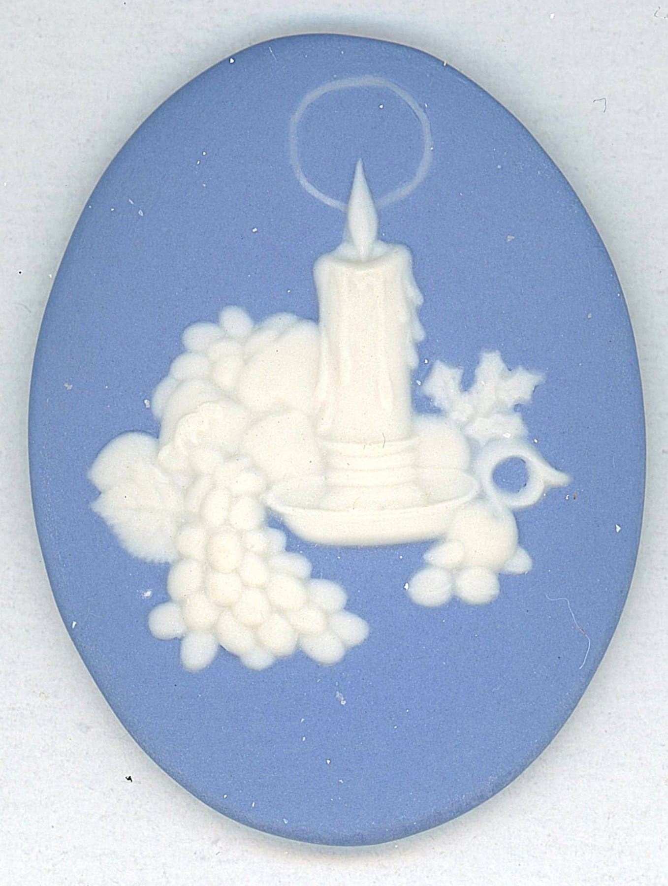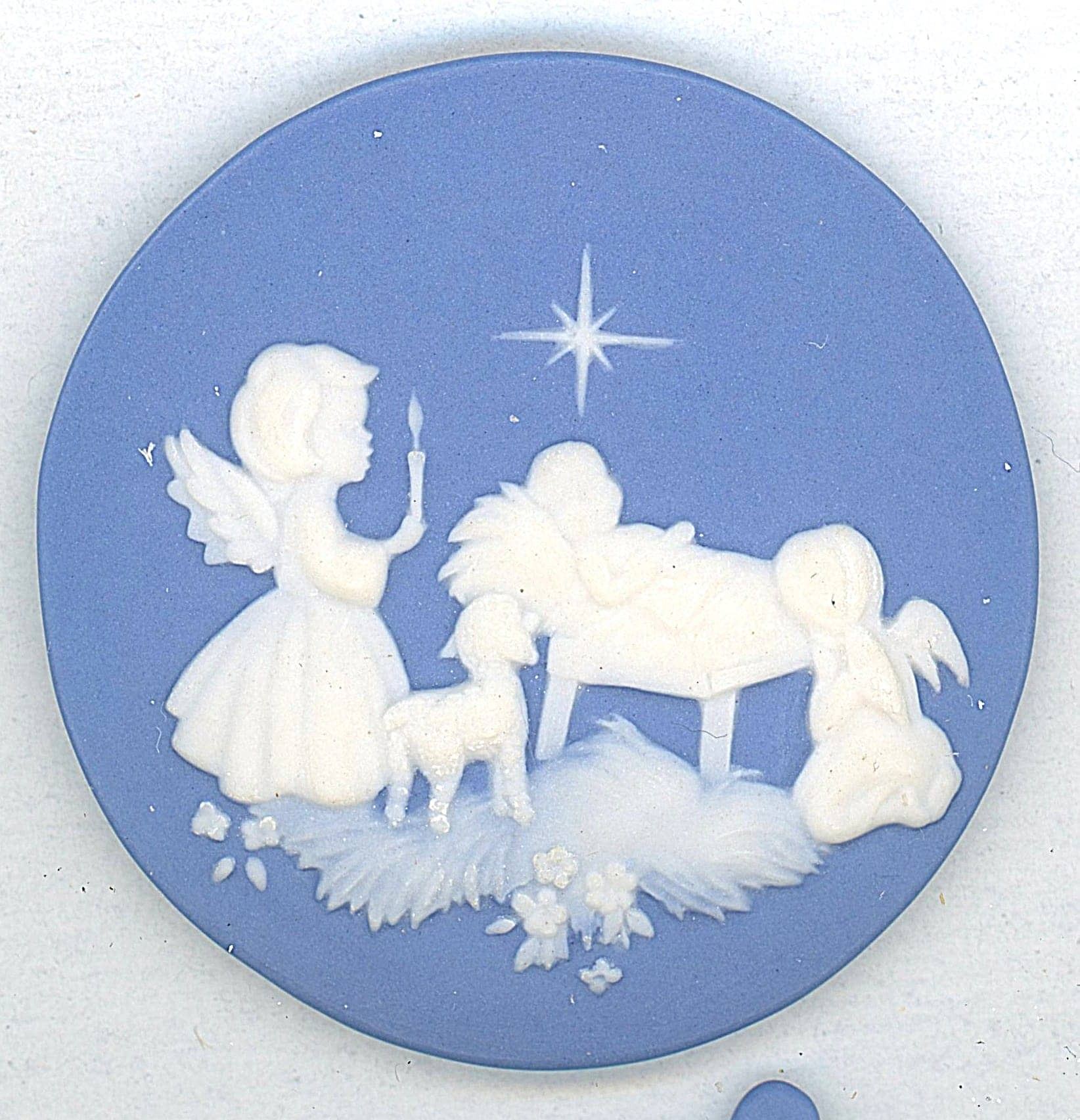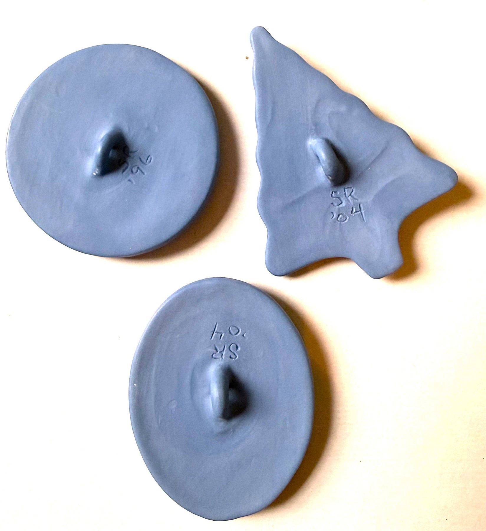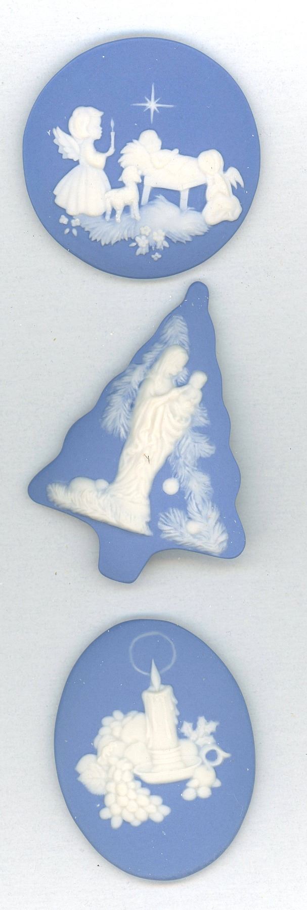 3 EX-Large 20th century blue Jasperware examples by Rzanski. The buttons on this small card are all dated 2004 and depict various Christmas scenes. Some nice shapes too.