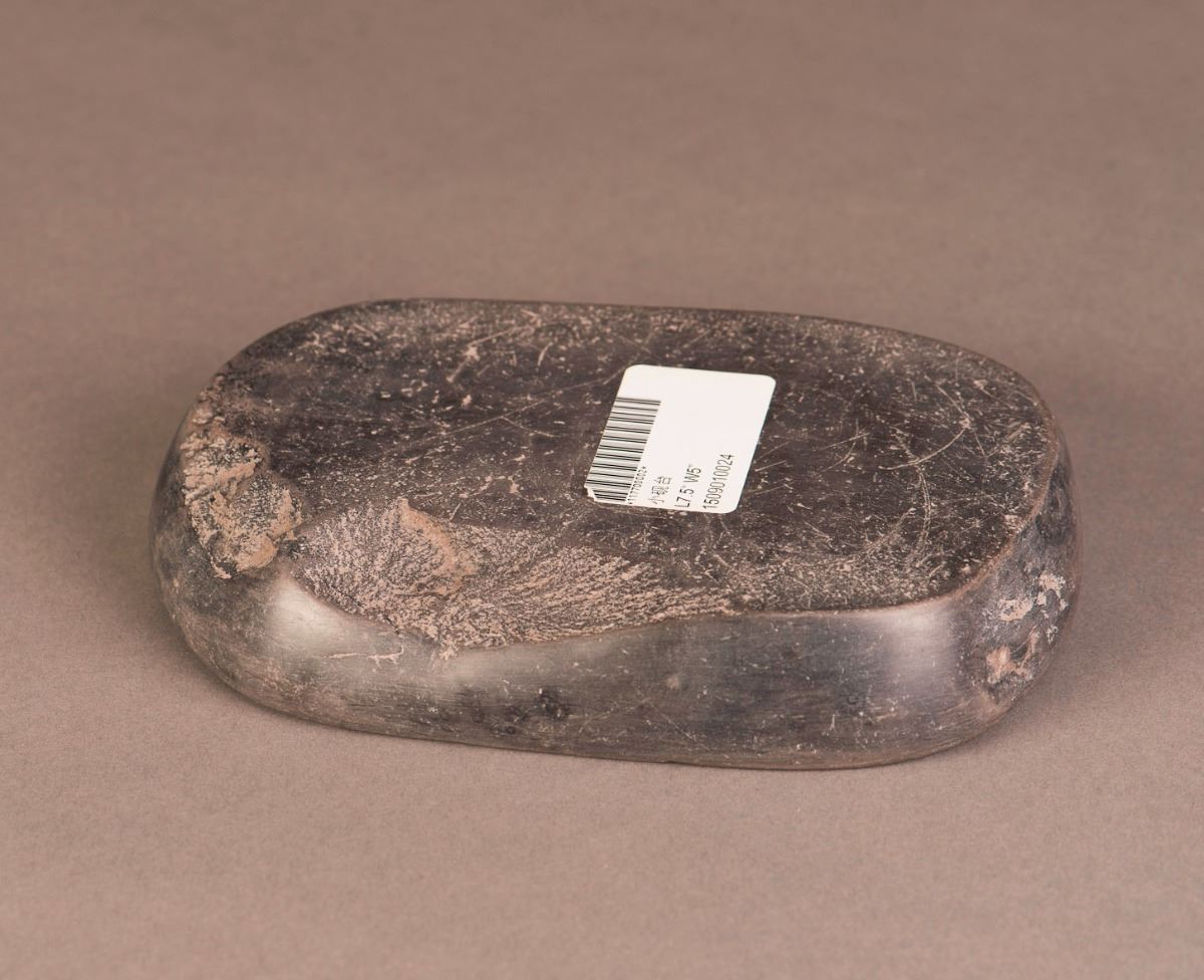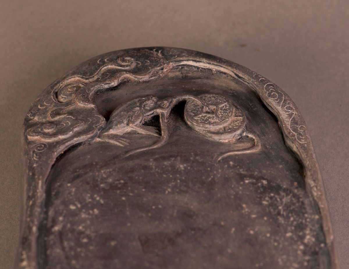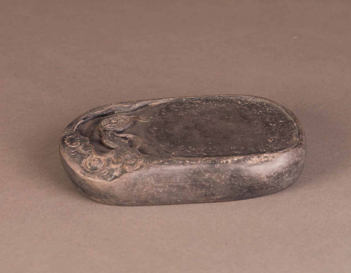 A small Chinese ink stone in oval shape, carved with animal and coins along with scrolling clouds on one end. Length 7.5“ Width5”