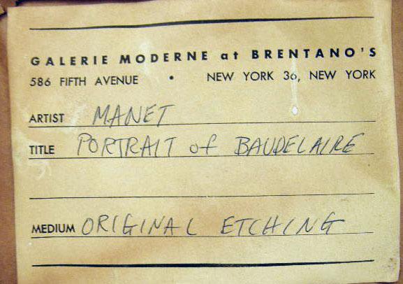 (French, 1832-1883). On laid paper, with the artist`s chop in the u.l.c., l.l.c. "Paint et grave par Manet 1862", l.r.c. "Imp. A. Salmon", verso with a label from Brentano`s Galerie Moderne, NY, noting "Artist Manet/Portrait of Baudelaire/Original Etching". Guerin 30, Harris 21. Sight size 4 1/4"h x 3 1/2"w