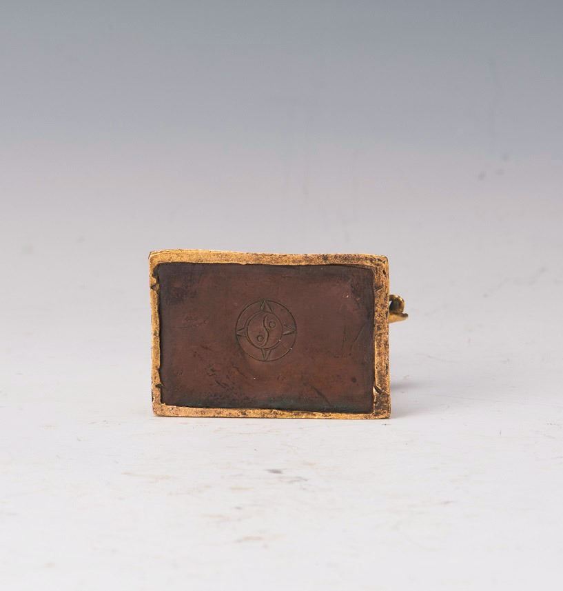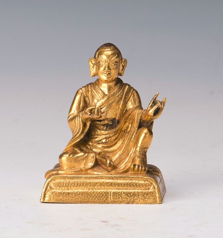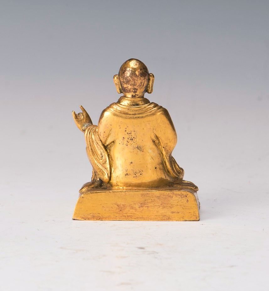 A small gilt Buddha in a seated stance and posed with two hands outstretched. Height 2.5" Diameter 2"