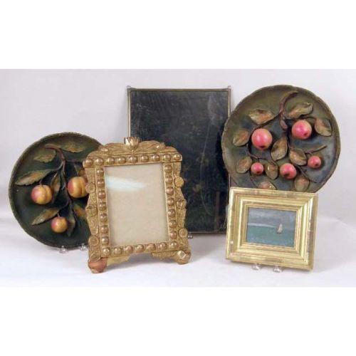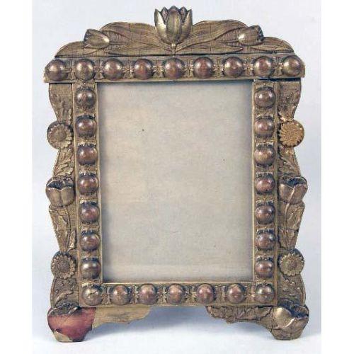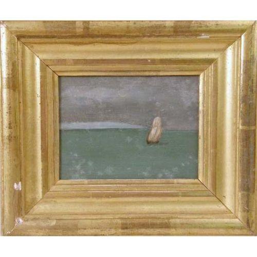 A SMALL OIL ON CANVAS<BR><BR>depicting a lone sailboat beneath a crescent moon. Unsigned. Together with a highly-carved and gilded picture frame