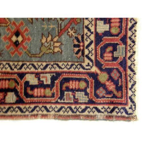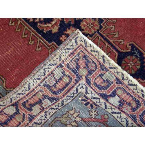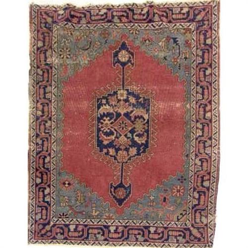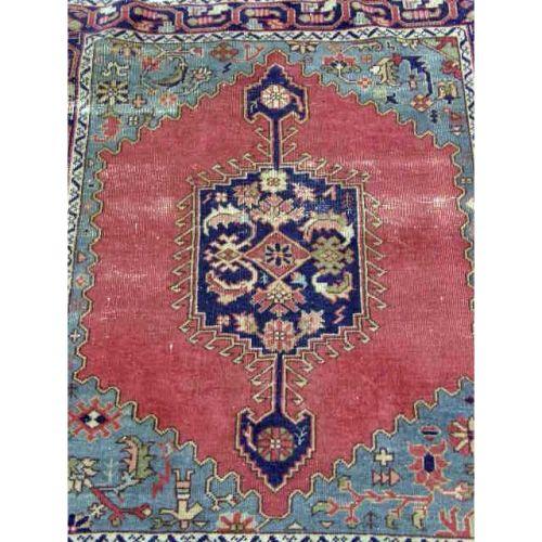 A SMALL PERSIAN RUG<BR><BR>With geometric medallion on a burgundy field with green border, worn, 4`9"l x 46"w