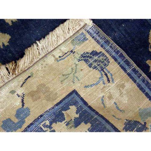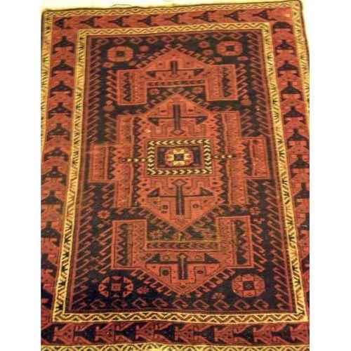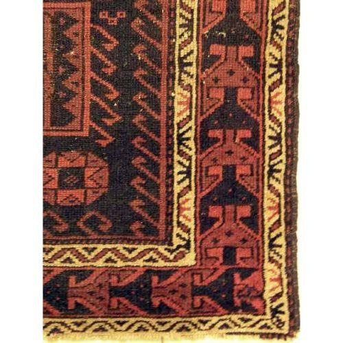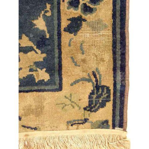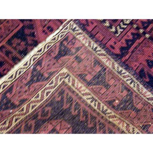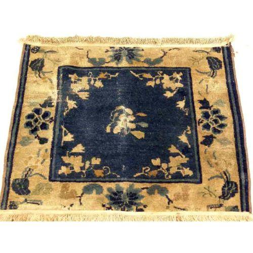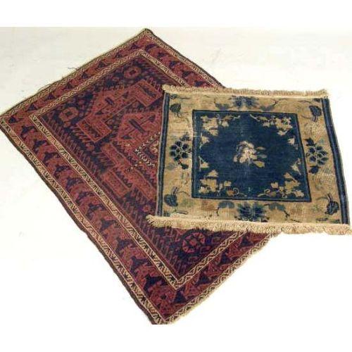 A SMALL TRIBAL RUG<BR><BR>Worked in tones of burgundy, navy, and ivory. Together with a small Chinese carpet, distressed, the larger: 4`10"l x 44"w 2 pieces.