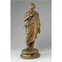 A SMELTER FIGURE OF GEORGE WASHINGTON “THE FATHER OF OUR COUNTRY.” A finely detailed caricature of George Washington holding his sword to his chest, standing atop of an architectural wooden base. SIZE: 22 1/2”. CONDITION: Excellent original condition with minor scuffs and wear to gilt finish. JL 1-3385 (300-500)