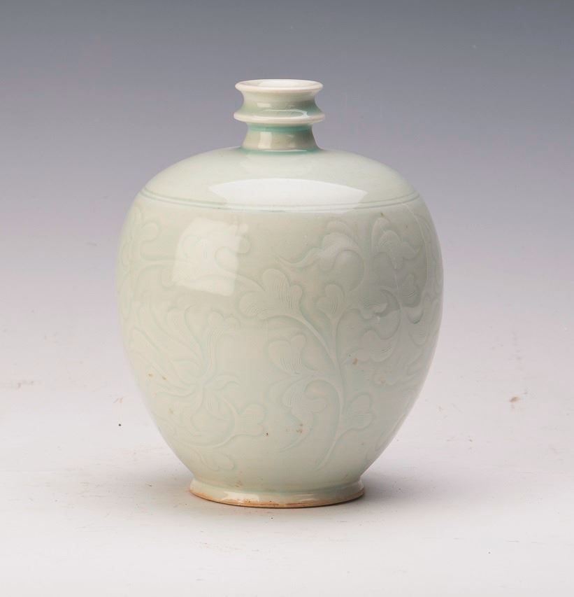 A fine light green glazed porcelain vase of small bottle mouth and plump body, with exquisite relief on the surface. Diameter 4.75" Height 6.75"