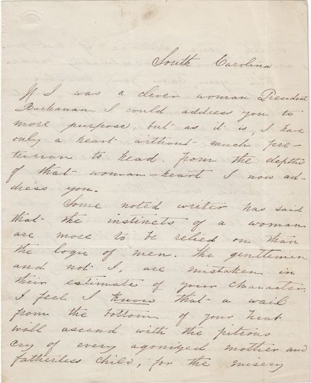 A superb content A.L.S., anonymously signed, "A Carolinian" 4pp. 8vo., "South Carolina" [n.d., but c. January - Feb. 1861]: "If I was a clever woman President Buchanan I would address you to more purpose, but as it is, I have only a heart without much pretension to head... I feel I know that a wail from the bottom of your heart will ascend with the piteous cry of every agonized mother and fatherless child, for the misery which your silence if not your actions will eventually cause. Will you, can you, involve a whole nation in war, and subject millions of unoffending females and helpless infants to all the ruthless horrors of civil strife, and more than that to the bloody massacres of a servile war?...Will you, can you give pretext to unscrupulous bands of yankee ruffians to walk in broad daylight over the rights and privileges of good citizens North & South. Do not think I am afraid the blood that is in my veins was never known to run cold in time of danger. O President! what a noble destiny awaits you! I believe you are a good man and in this belief, I on my bended knees beg you to pause. Take back the power, yours by right, which you have given up to an irregular disorderly Congress. Restore peace to the Country, and to the hearts of millions who have been proud to call you father. So use your own words will you govern us if you conquer us? (which, by the way, is ____ible) Then why not let us go our own way, in peace when nothing can be gained by coercion, but bloodshed and misery. How can [you] ask us to relinquish forts which will surely be used in the next administration against us instead of for the purpose for which they were built. O President Buchanan heed not the advice of Gen. Scott he is a man of war t'is his life. What cares the vulture for the screams of the motherless childless eagles? O President do you already hear the wail of anguish that goes up from the heart of a nation? Give up our property and let us alone. If we have chosen badly let us bear the penalty. Yankeedom says it is independent of us. If my friends knew I wrote this they would say I was suing to an enemy. But I am a woman and you can't refuse me." From the papers of Adam Glossbrenner who served as Buchanan's private secretary between 1860 and 1861. Usual folds, else fine condition.