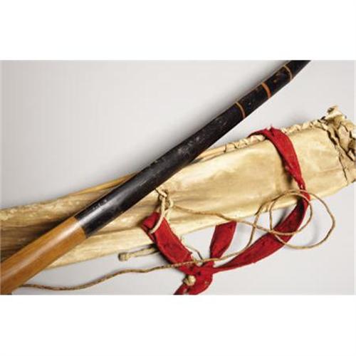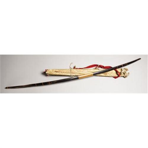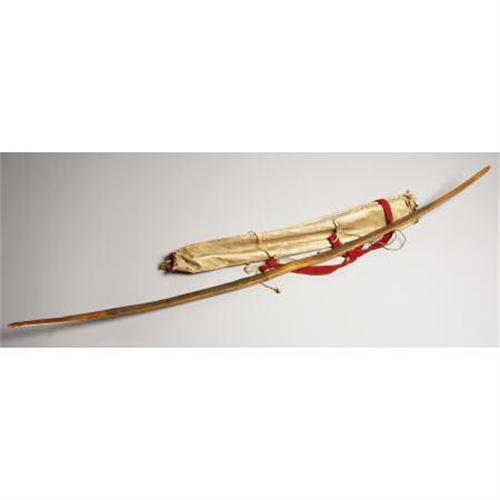 <B>A SOUTHERN PLAINS RAWHIDE QUIVER</B></I><BR><BR>c. 1880 trimmed with red wool trade cloth and enclosing seven painted arrows; together with California (?) wood bow, one side decorated with black pigment, the other with green pigment<BR><BR>Lengths: quiver, 29 3/4 inches; bow, 55 inches <B>Condition Report:</B> Wood bow overall very good with surface scratches and some pigment loss. Chip approx. 1/8" on one end of bow. Quiver overall good. Hide stiff, approx. 2 small holes. Cloth strap with moderate loss. No apparent restoration.<BR><BR><b>Shipping:</b> Requires 3rd Party Shipping (<a target="_blank" href="http://www.heritageauctions.com/common/shipping.php">view shipping information</a>)