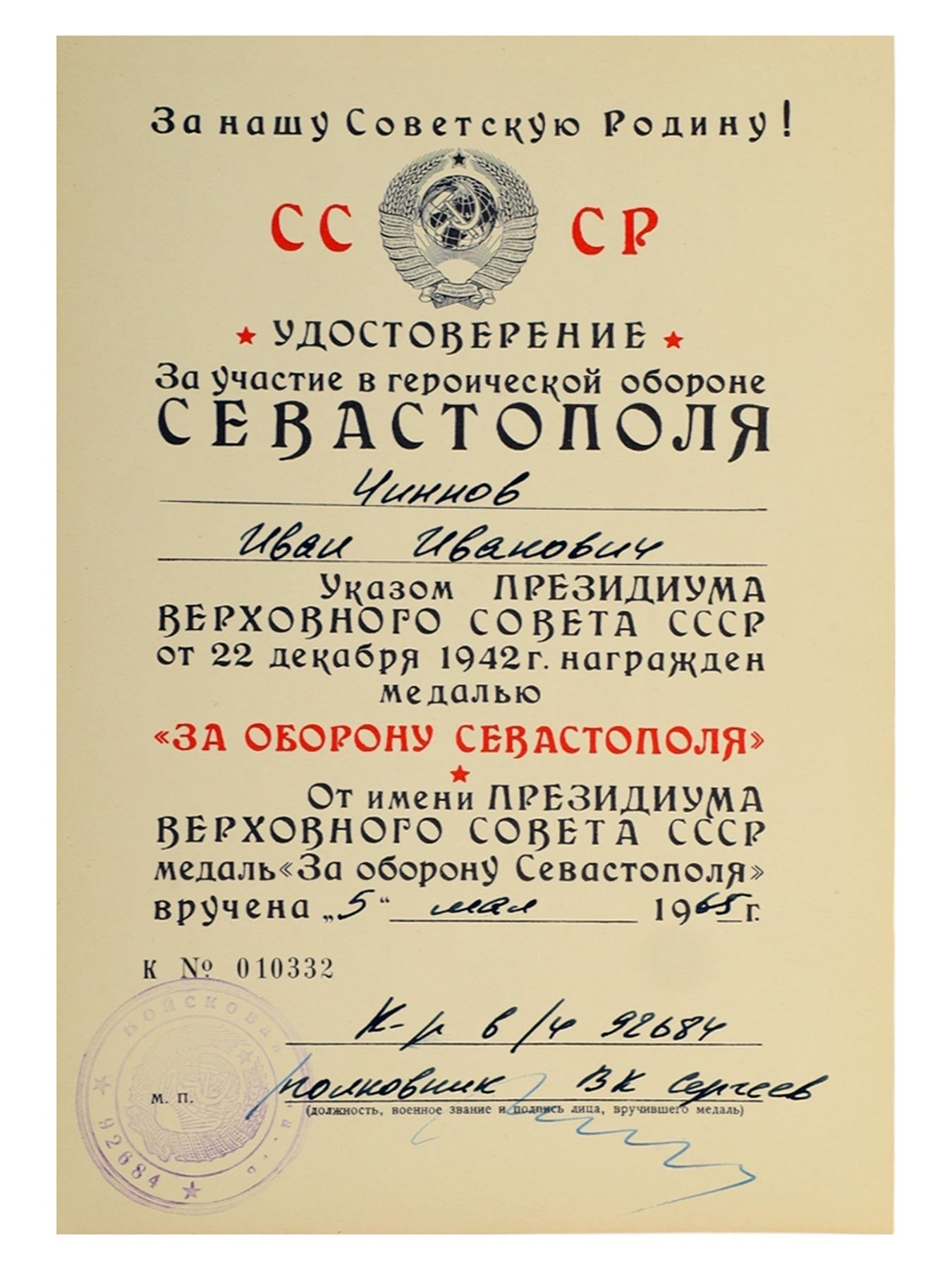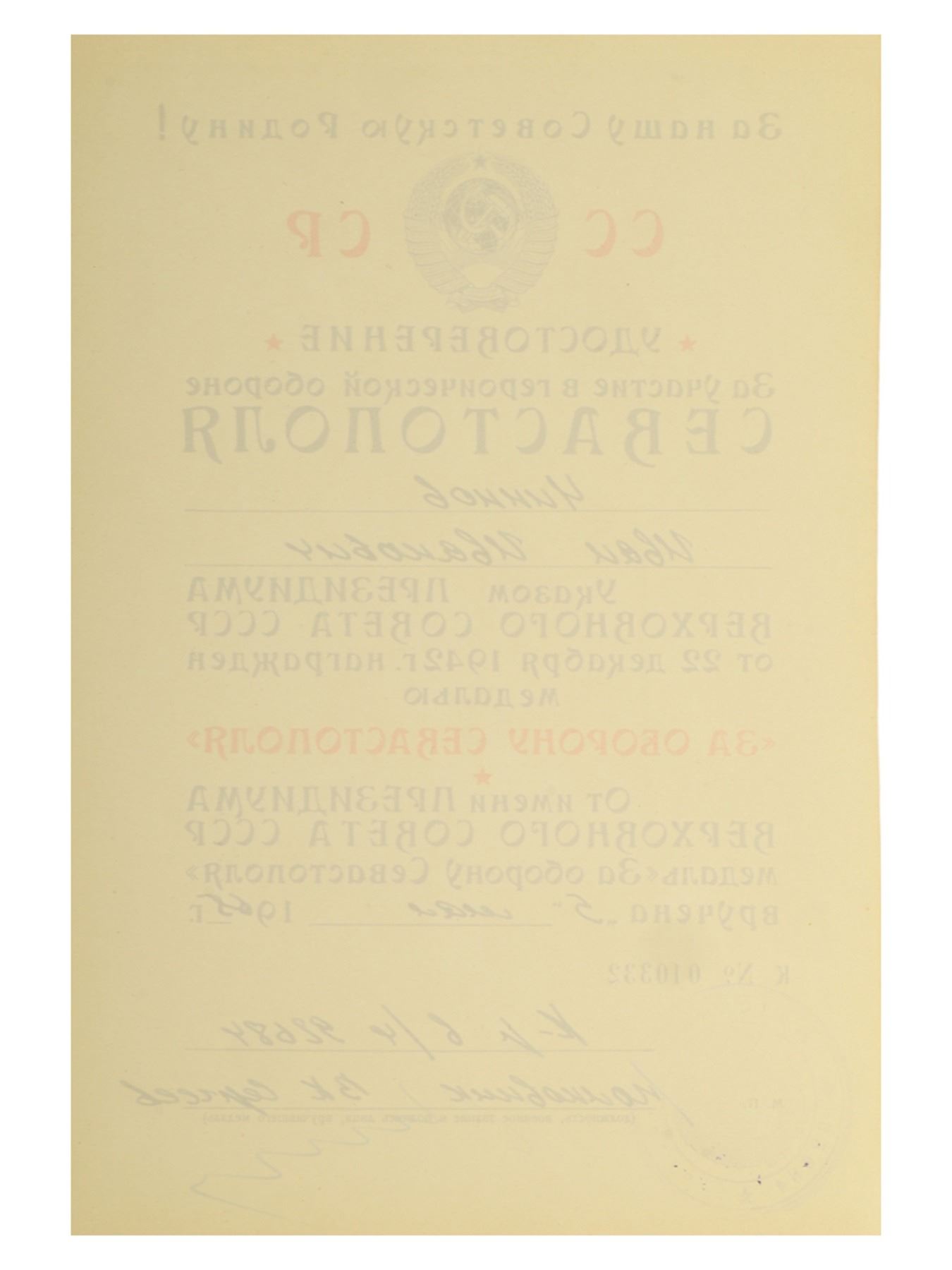 A Soviet award citation which was awarded for the defense of Sevastopol during WW2 in 1942. It was issued in 1965.