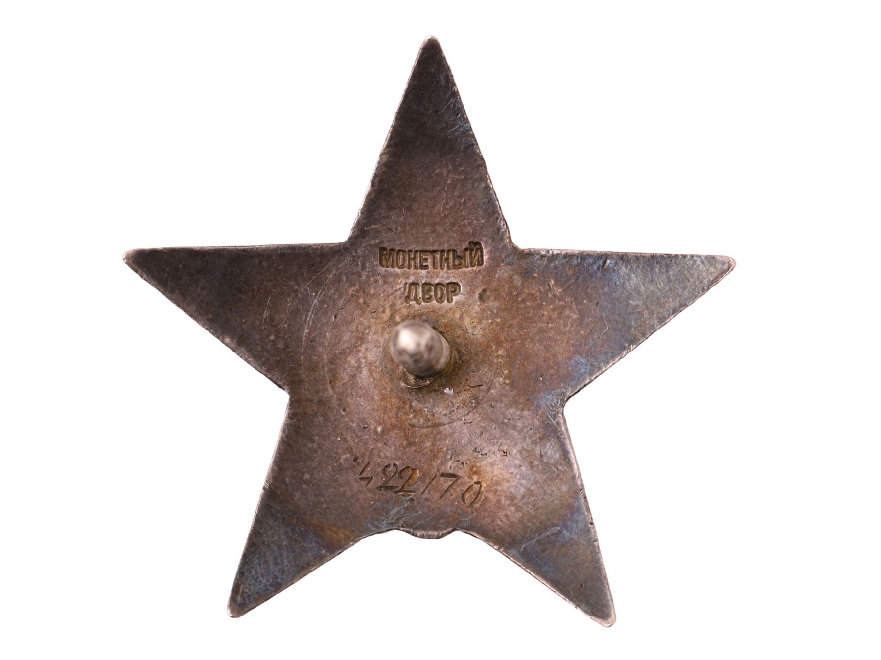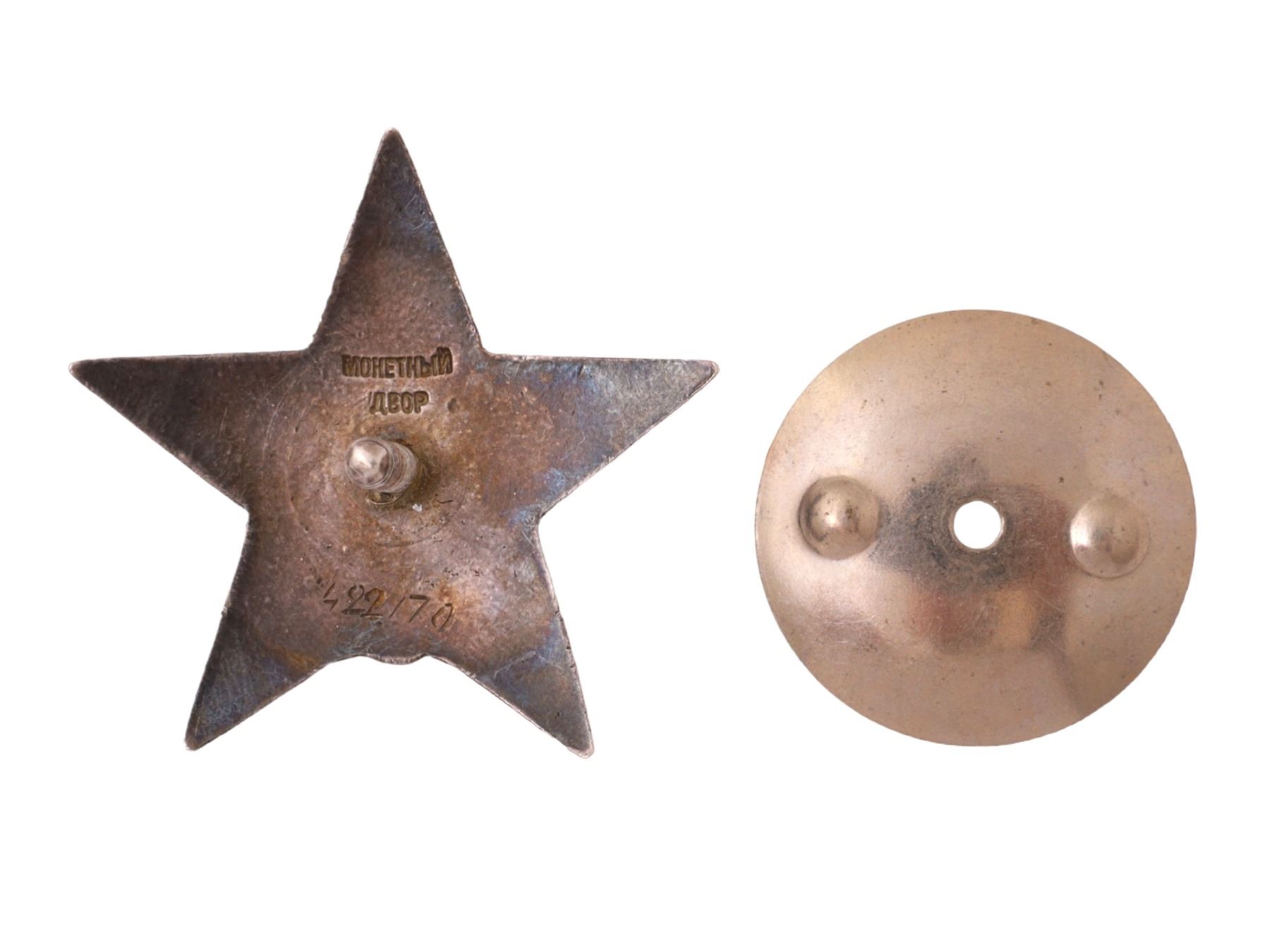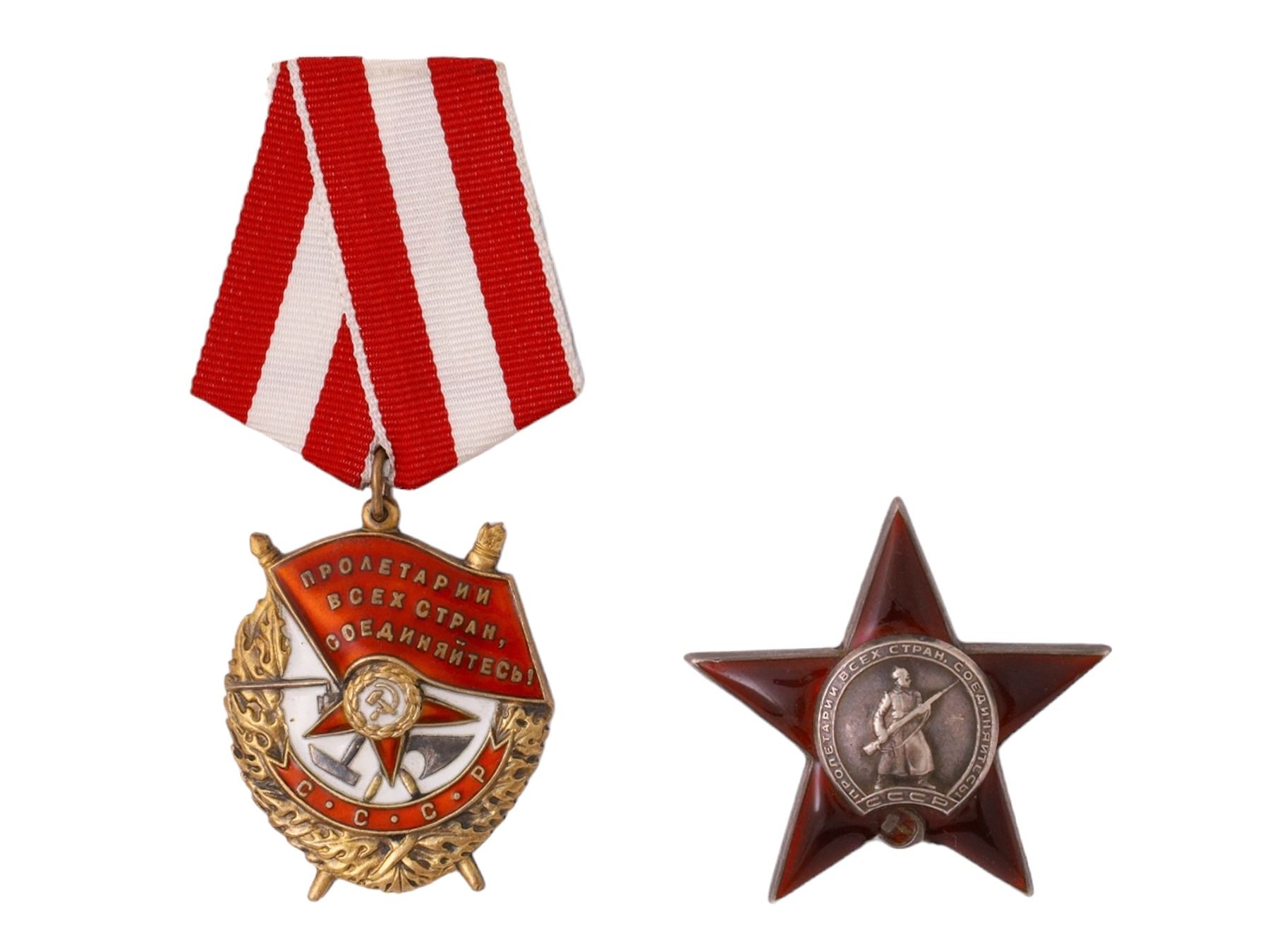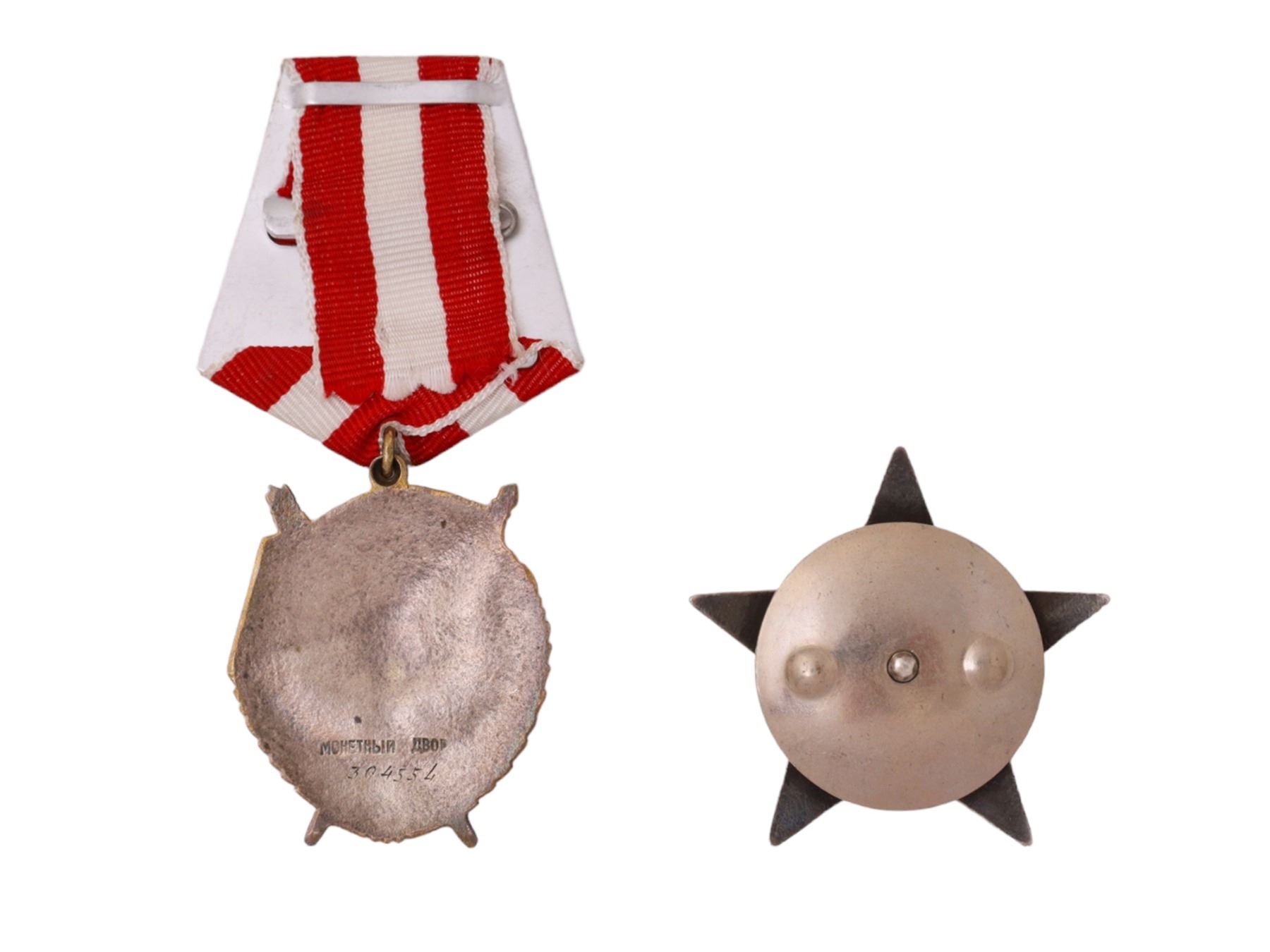 A set of two Soviet award medals. The first is the Order of the Red Banner, s/n 304554 which was first instituted during the Russian Civil War and was the highest award in the Soviet Union until the Order of Lenin was established in 1930. The second is the Order of the Red Star, s/n 422170 which was awarded for contribution to the defense of the USSR.
