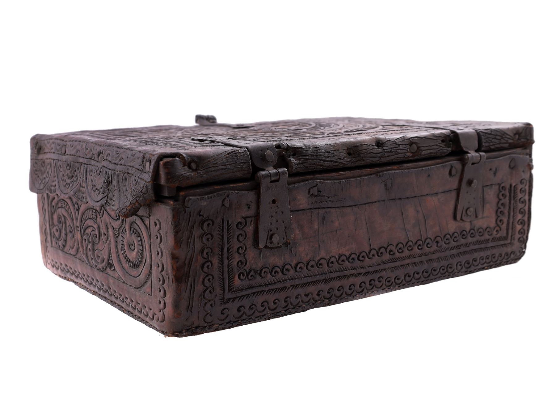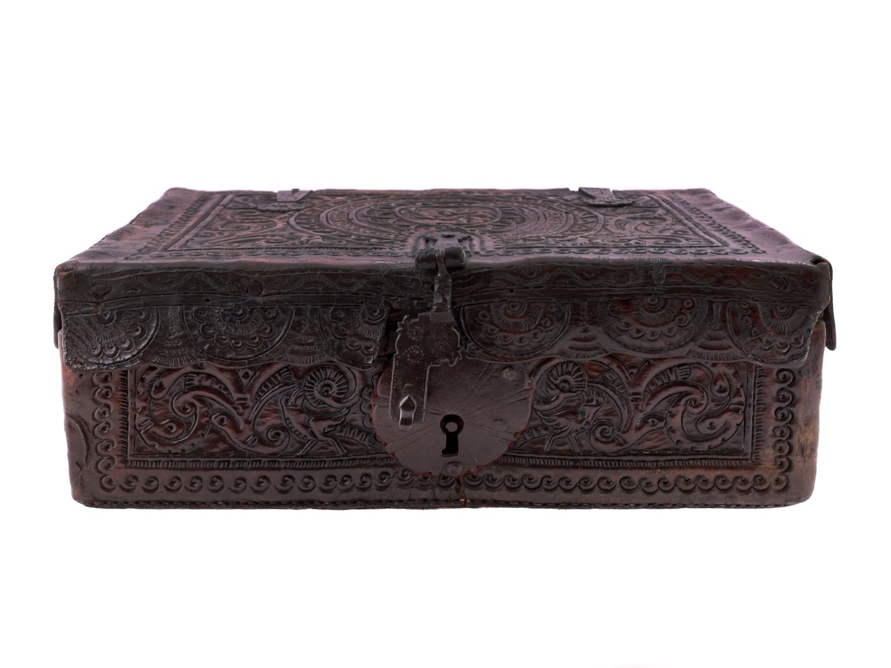 Spanish Colonial embossed leather document box. The chest is covered with embossed leather elaborately decorated with a geometrical design and features a mythical creature on the lid of the box.