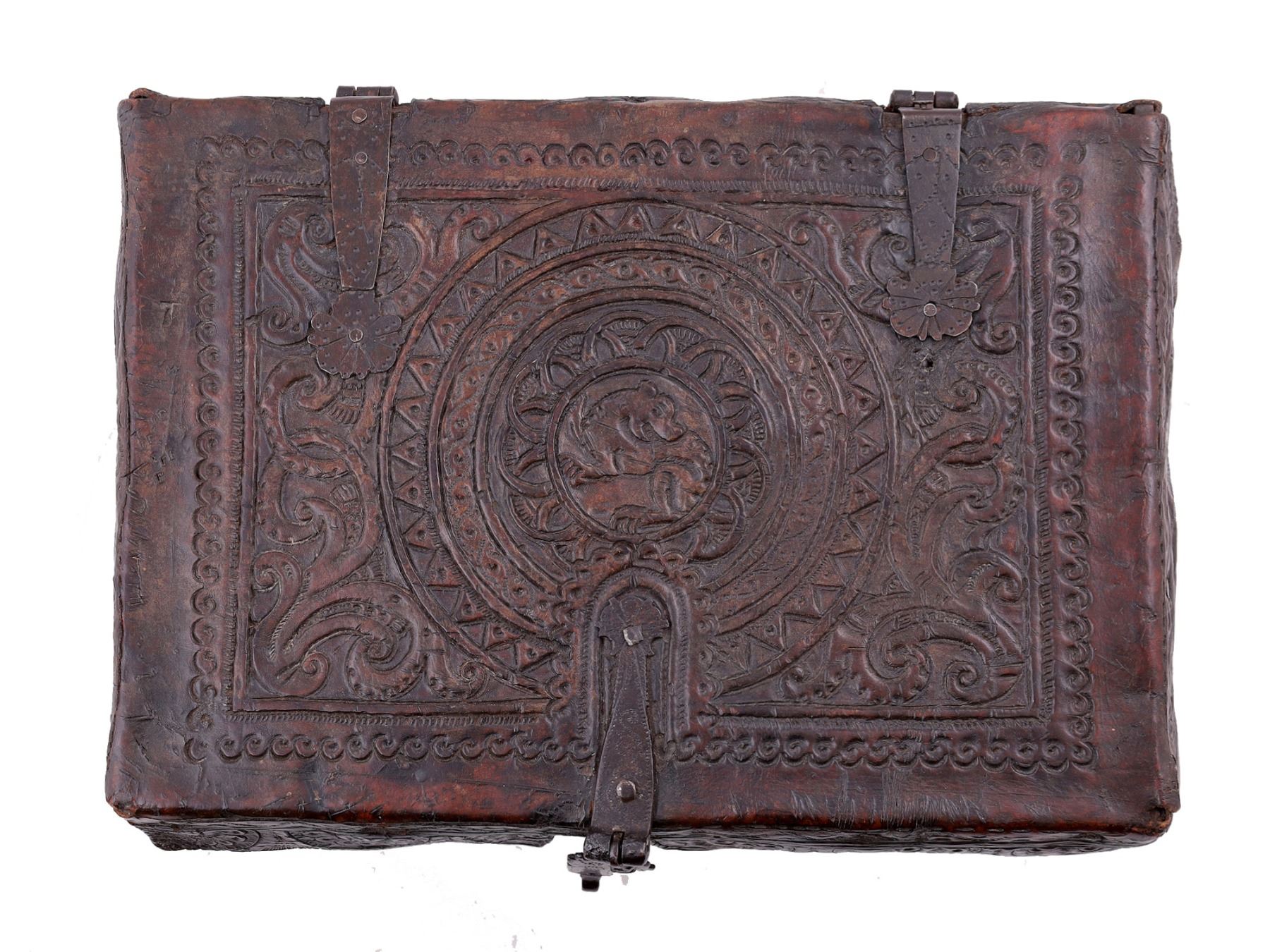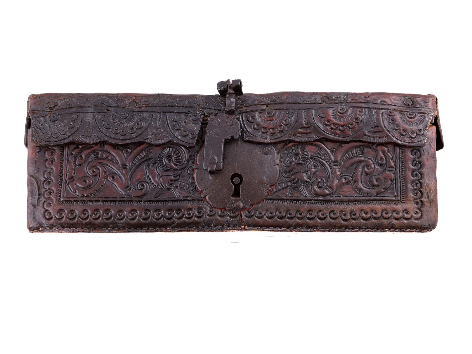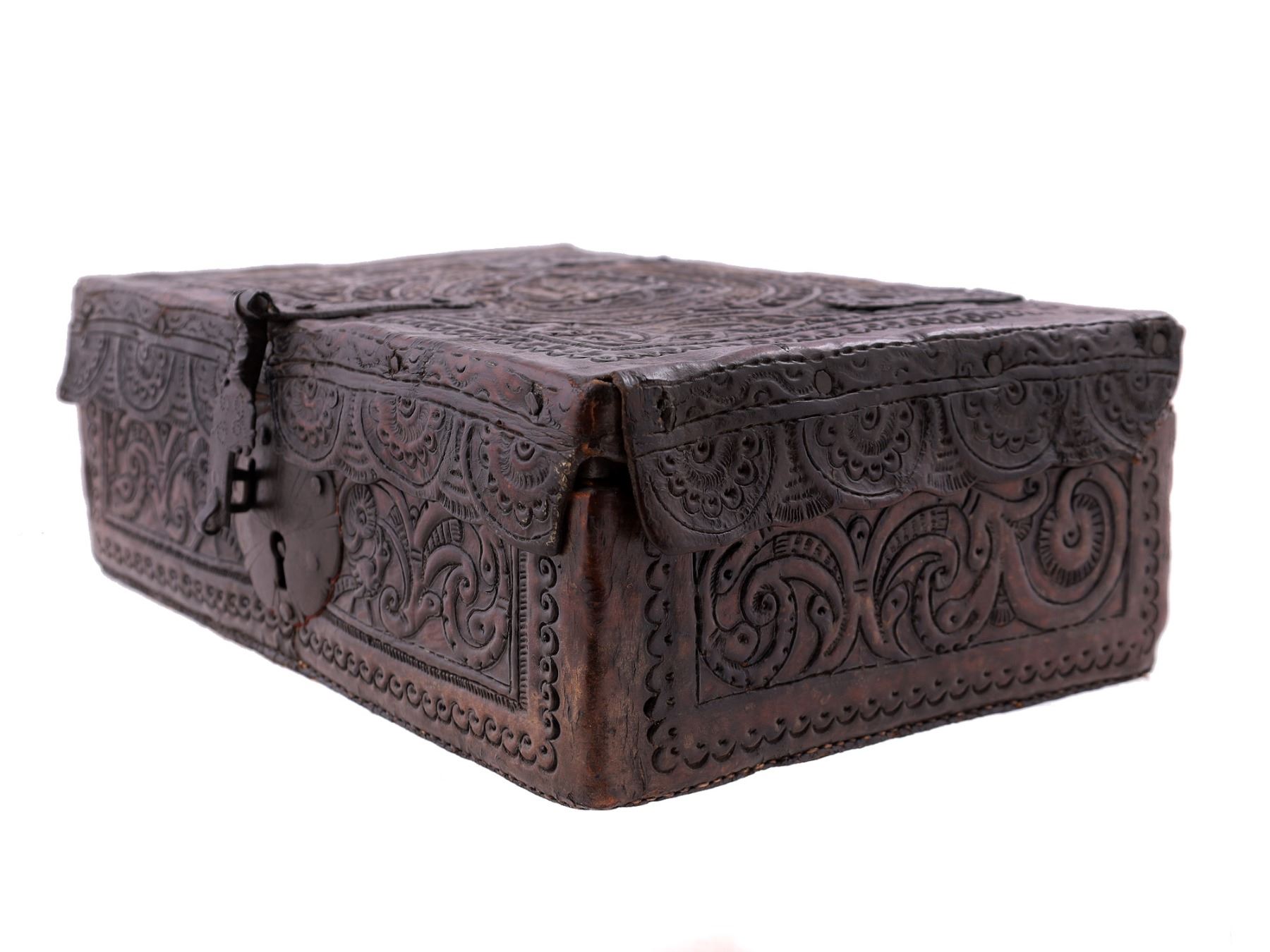 A SPANISH COLONIAL EMBOSSED LEATHER DOCUMENT BOX, 18TH CEN.