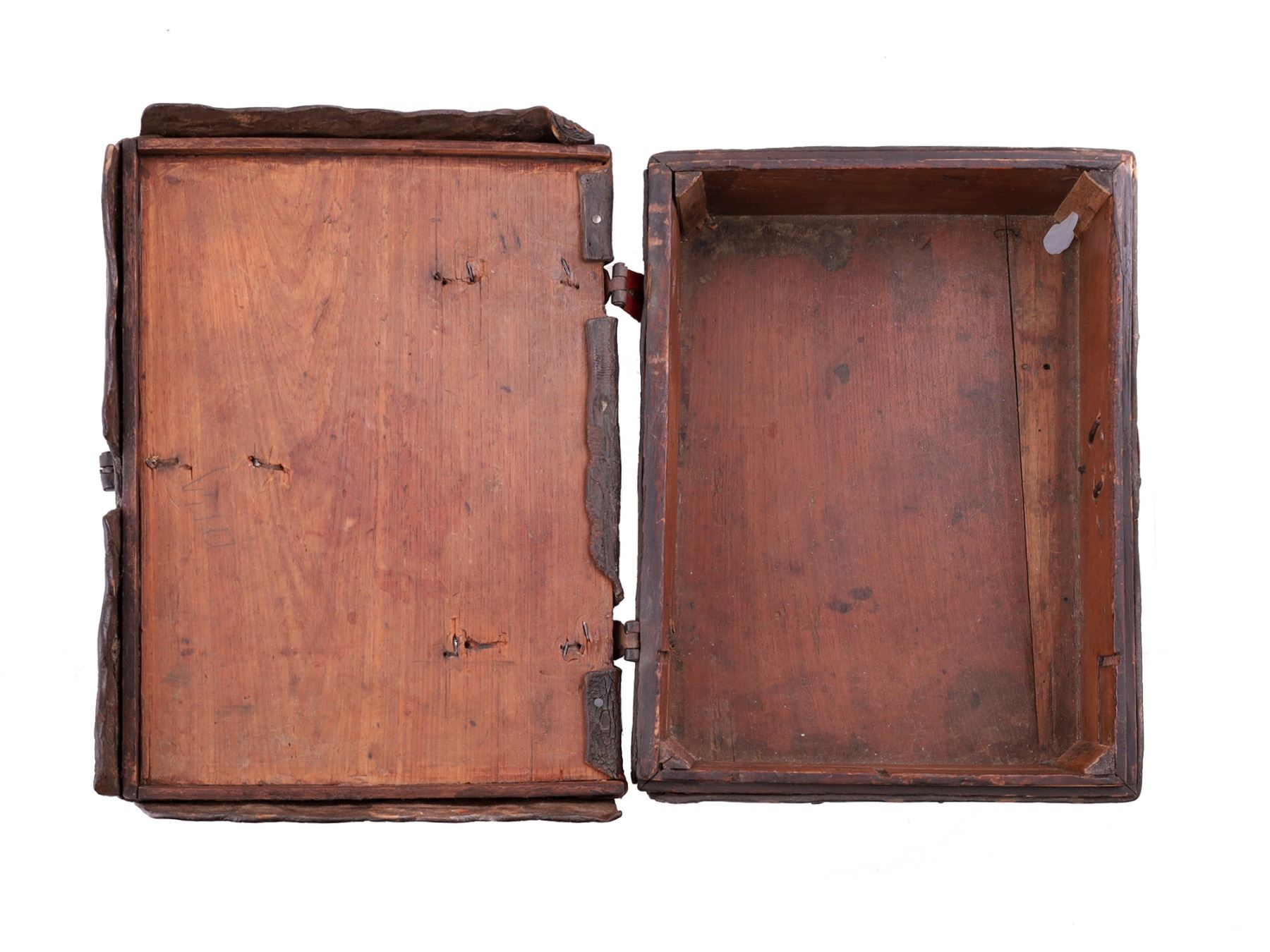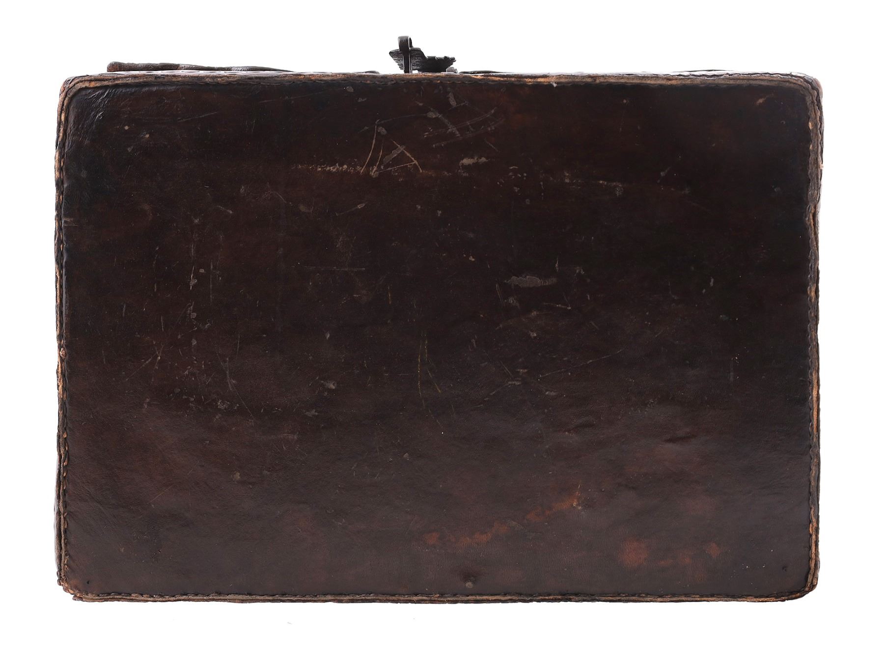 The leather is original and does not show any restoration. The wooden interior has a crack which was caused by the wood shrinkage over time. The iron hinges and lock are in their original condition. The key is missing.