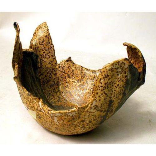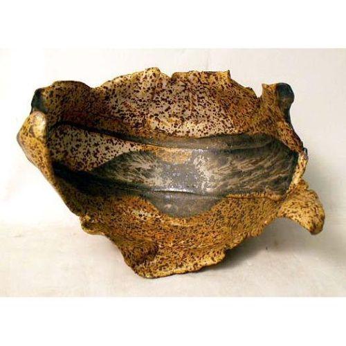 A SPECKLED GLAZED FREE FORM REDWARE BOWL<BR><BR>Possibly Hartsook, monogrammed on the underside "HP". 9"w.
