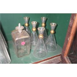 A SQUARE DECANTER AND STOPPER, with gilt decorations; a Continental beaker; and five small decanters.