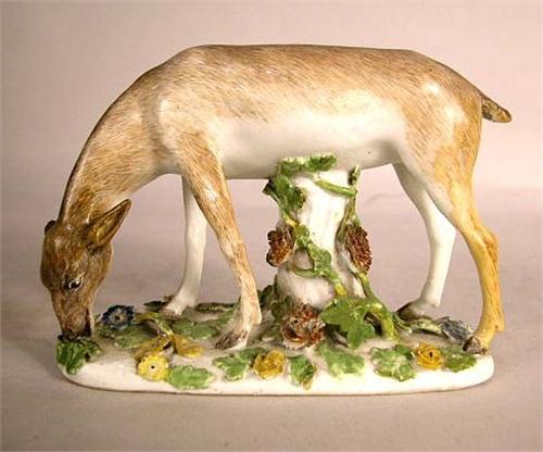 A STAFFORDSHIRE FIGURE OF A DEER FEEDING; 5 3/4"l, losses