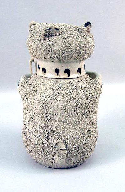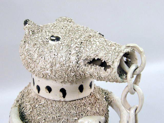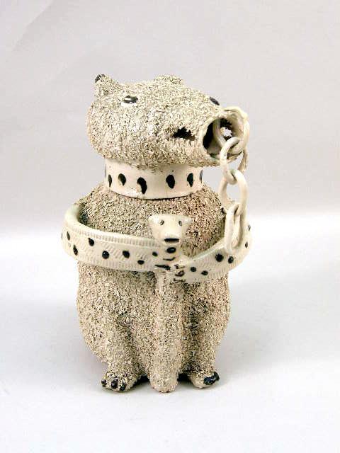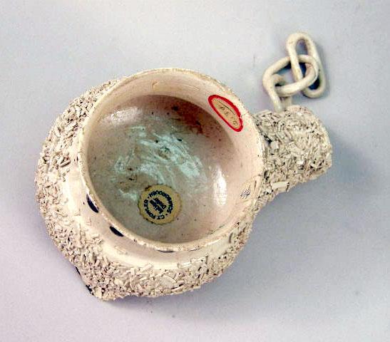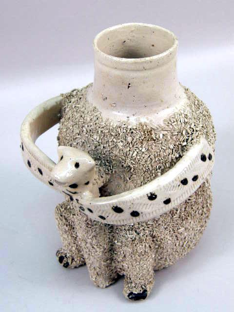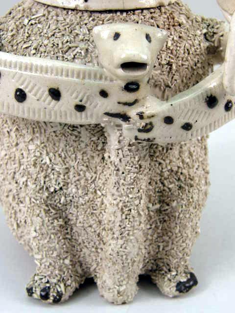 With applied ceramic decoration to simulate fur, verso labeled "CT Fowler Antique Dealer, Scarborough". Unidentified museum accession mark number 57-83296. 9 1/2"h Age cracks, chips to underside of rim.