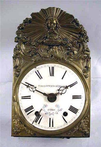 A STAMPED GILT BRASS AND ENAMELED HANGING WALL CLOCK; the dial face inscribed " Francois Rineaud-Cremault/a Chize", France, with two weights, pendulum and replacement winding key, dents to brass, discoloration and minor losses to enamel, majority of gild