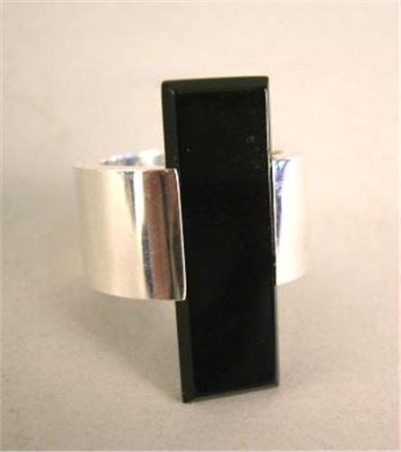 A STERLING SILVER AND ONYX GEOMETRIC DESIGN RING;