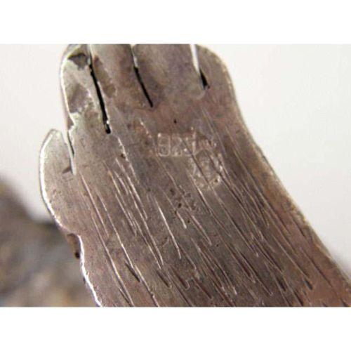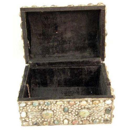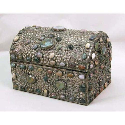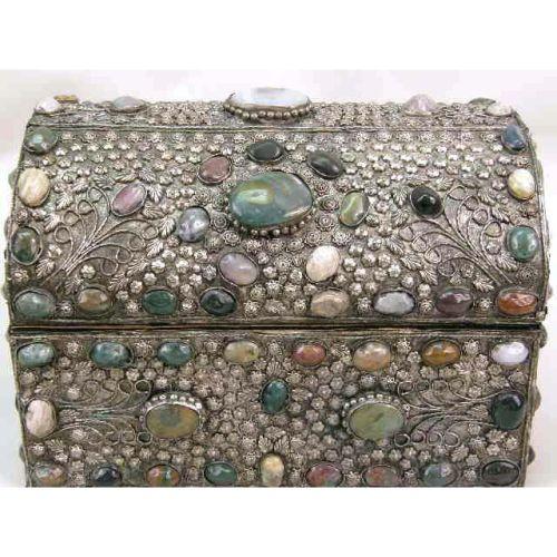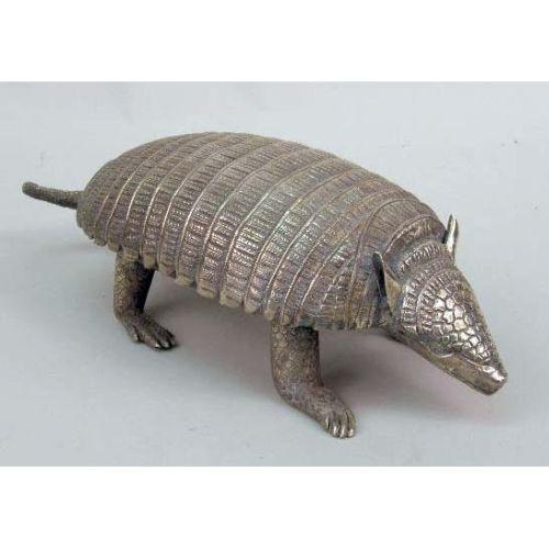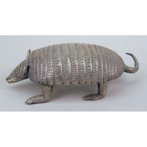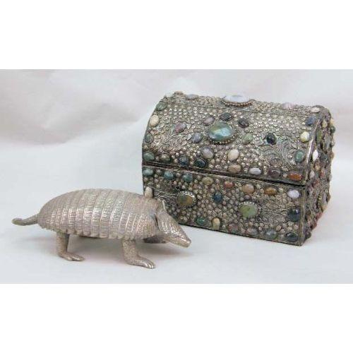 A STERLING SILVER ARMADILLO<BR><BR>Mexico, 40oz. Together with a large tin and polished agate covered chest, armadillo: 4"h x 12-1/2"w x 5-1/2"d. 2 pieces