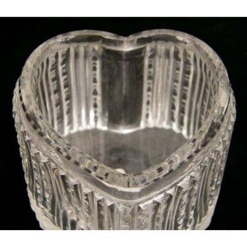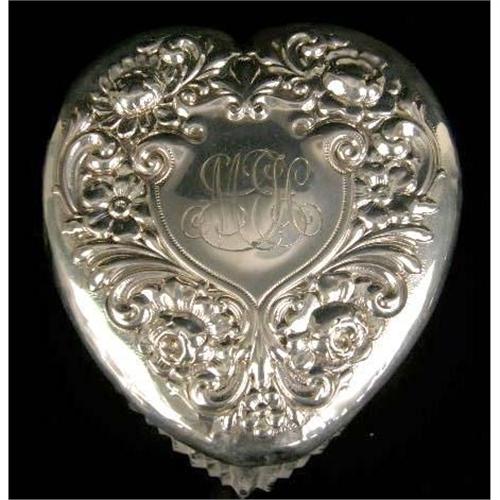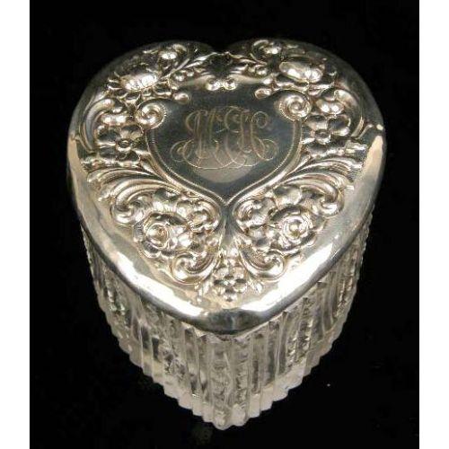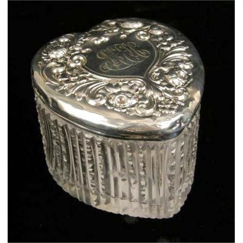 A STERLING SILVER LIDDED GLASS HEART-FORM DRESSER BOX<BR><BR>2-1/2`high x 3-1/2"diameter, dents