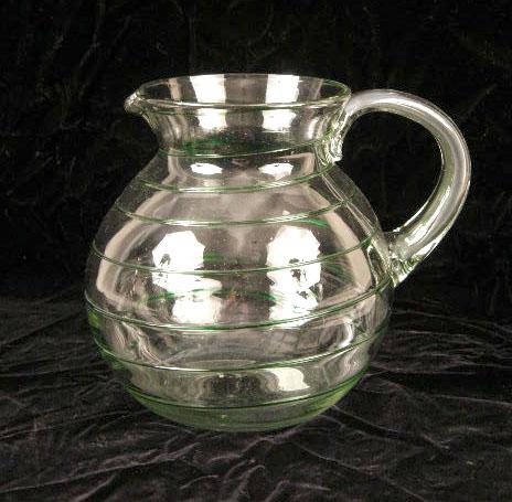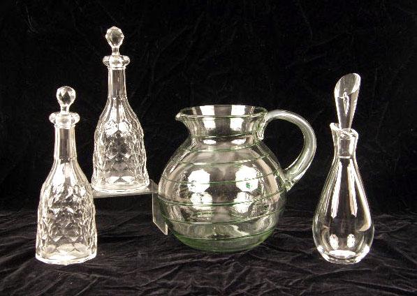 Together with a pair of colorless glass stoppered decanters, and a hand-blown ribbed colorless glass pitcher. 4 pieces. 12"h and 11"h, respectively
