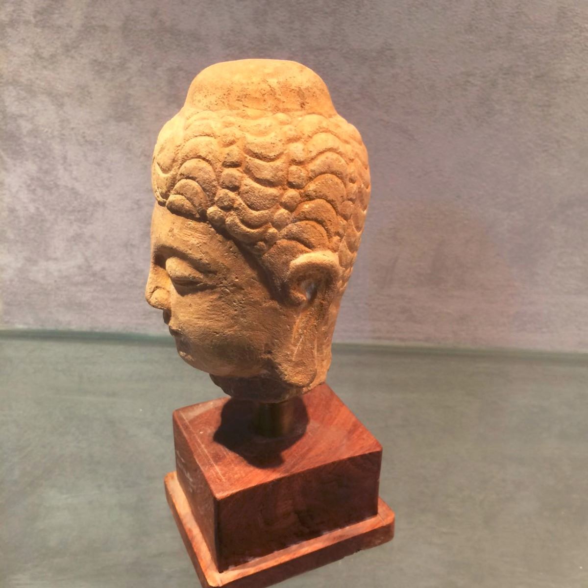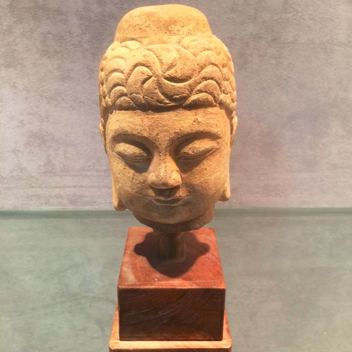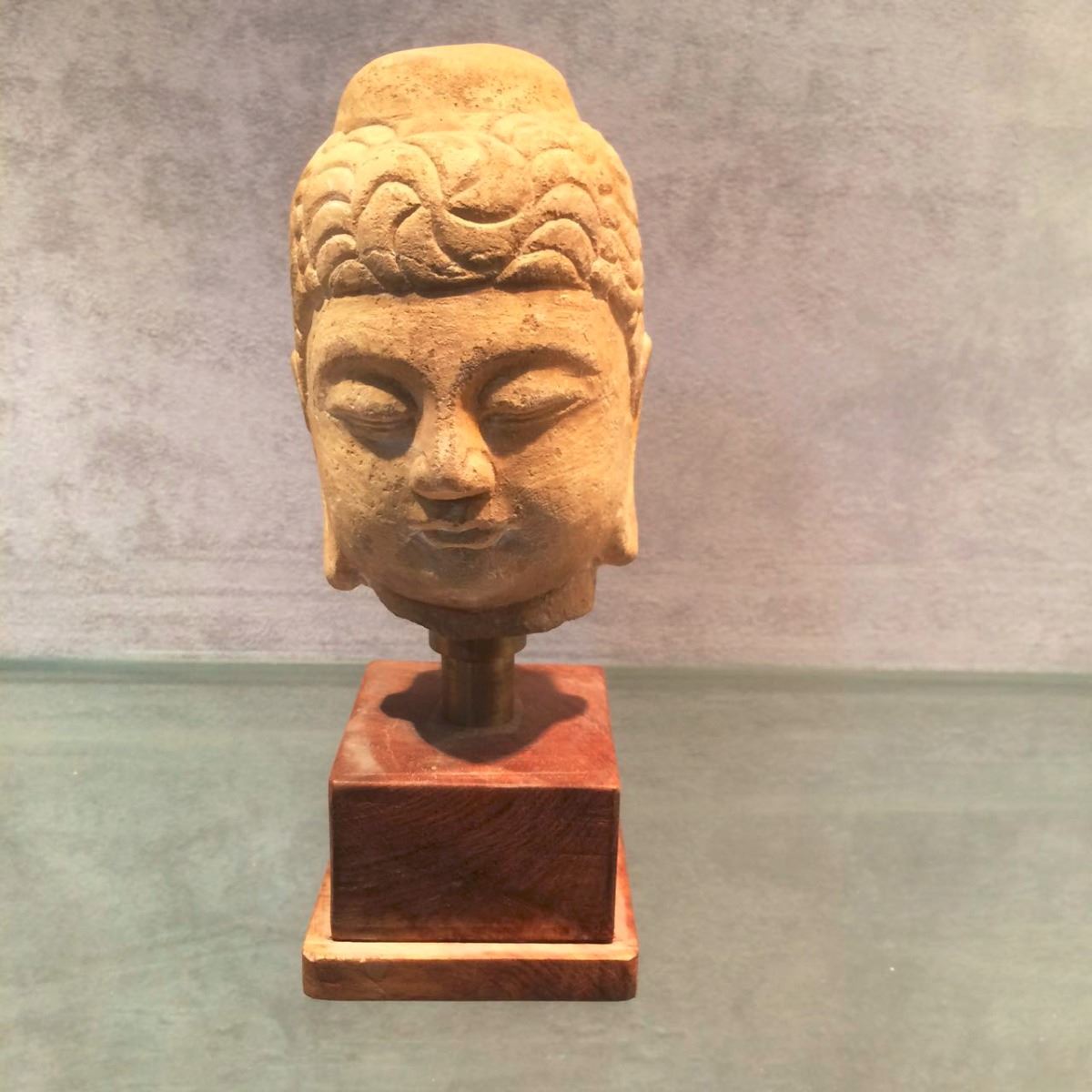 A stone-carved Buhhda head, after Tang Dynasty style, eyes slightly closed in serene expression, hair tied up in one knot. Height 4.75"