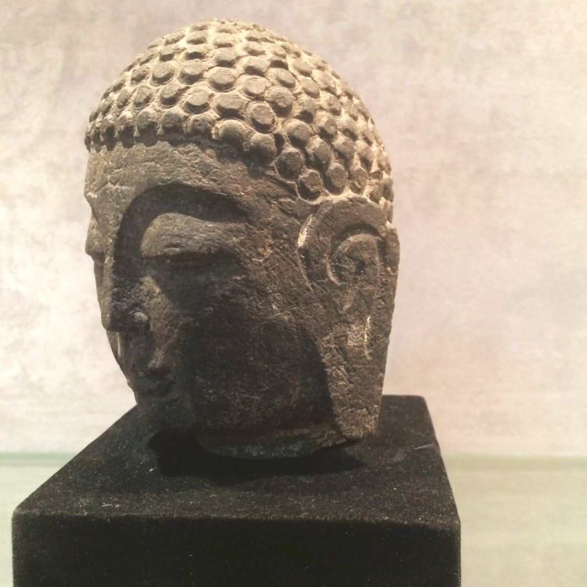 A stone-carved Buhhda head, after Tang Dynasty style, eyes slightly closed in serene expression. Height 4.25"