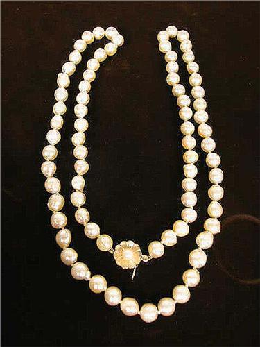 A STRAND OF BAROQUE CULTURED PEARLS; 8-8-1/2"mm, with 14k yellow gold and pearl floral-form clasp, 32" long
