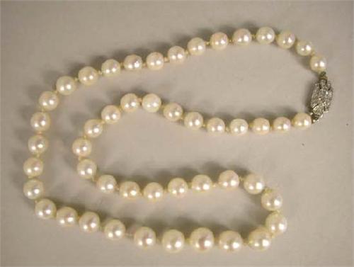 A STRAND OF SLIGHTLY GRADUATED PEARLS WITH A DIAMOND CLASP; 17"l