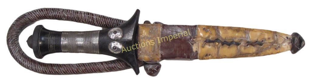 The ebony grip with silver studs and wire wrap and broad blade, the leather scabbard with white crocodile mounts retains its braided armband. Late 19th century. Overall length 30 cm.