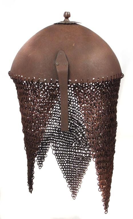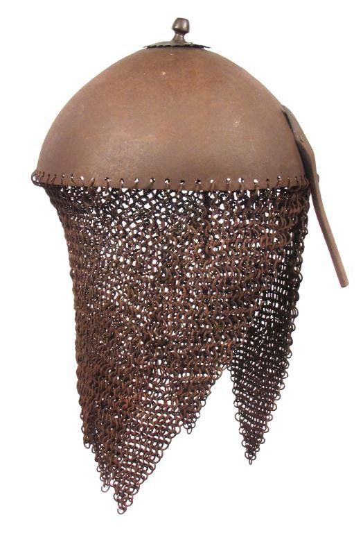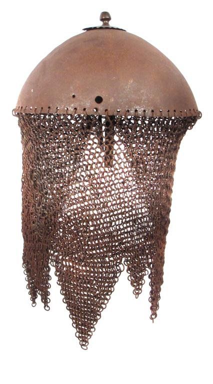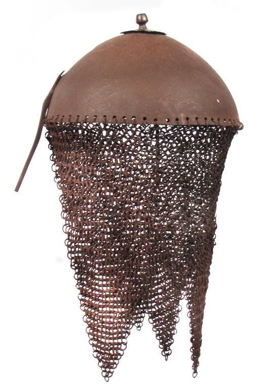 The hemispherical bowl forged of a single piece of steel, with robust nasal and brass finial. The camail of riveted rings.Mid-19th century .Worn overall .Overall height with camail 40 cm. Condition III